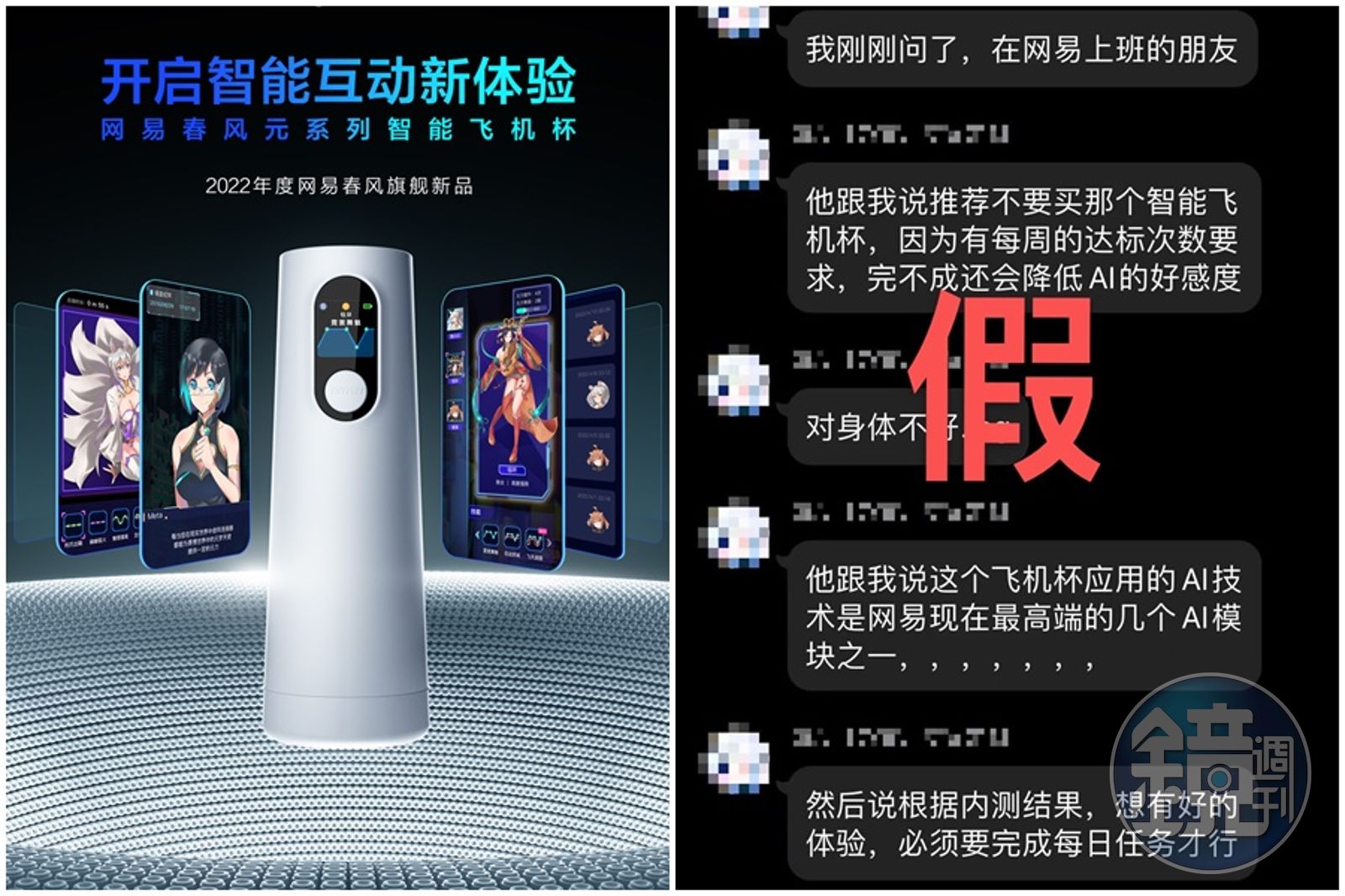 沒想到,有中國網友稱朋友在該公司上班,並呼籲不要買該產品,因為飛機杯配合的遊戲App設定了每日、每週的達標任務,若沒達標會降低該AI角色的好感度,網友們紛紛有「精盡人亡」的既視感,替男性玩家捏了一把冷汗。