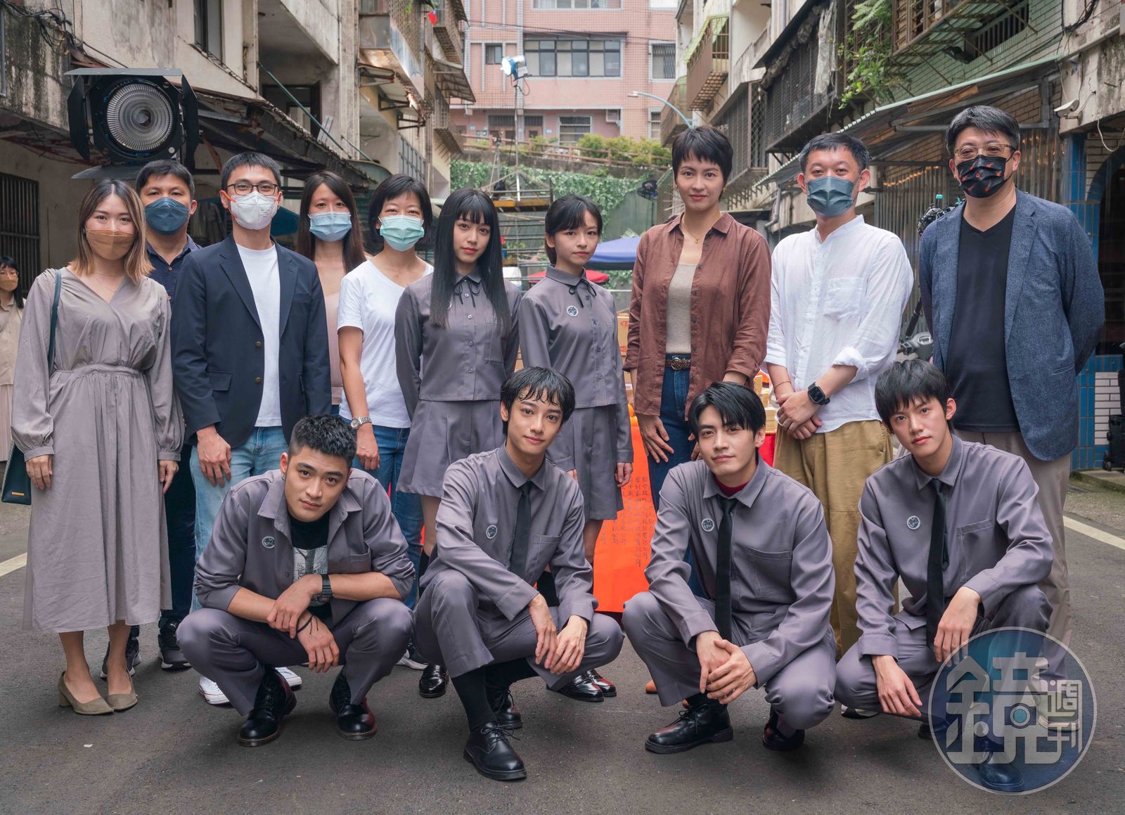 恐怖懸疑影集《聰明鎮》日前開鏡,導演謝駿毅(後排右2)、製作人徐國倫率演員梁詠琪(後排右3)、陳姸霏(後排右4)、宋柏緯(下排右2)著戲服熱鬧出席。(奇蹟映畫所提供)發布時間:2022.06.21 14:09 臺北時間