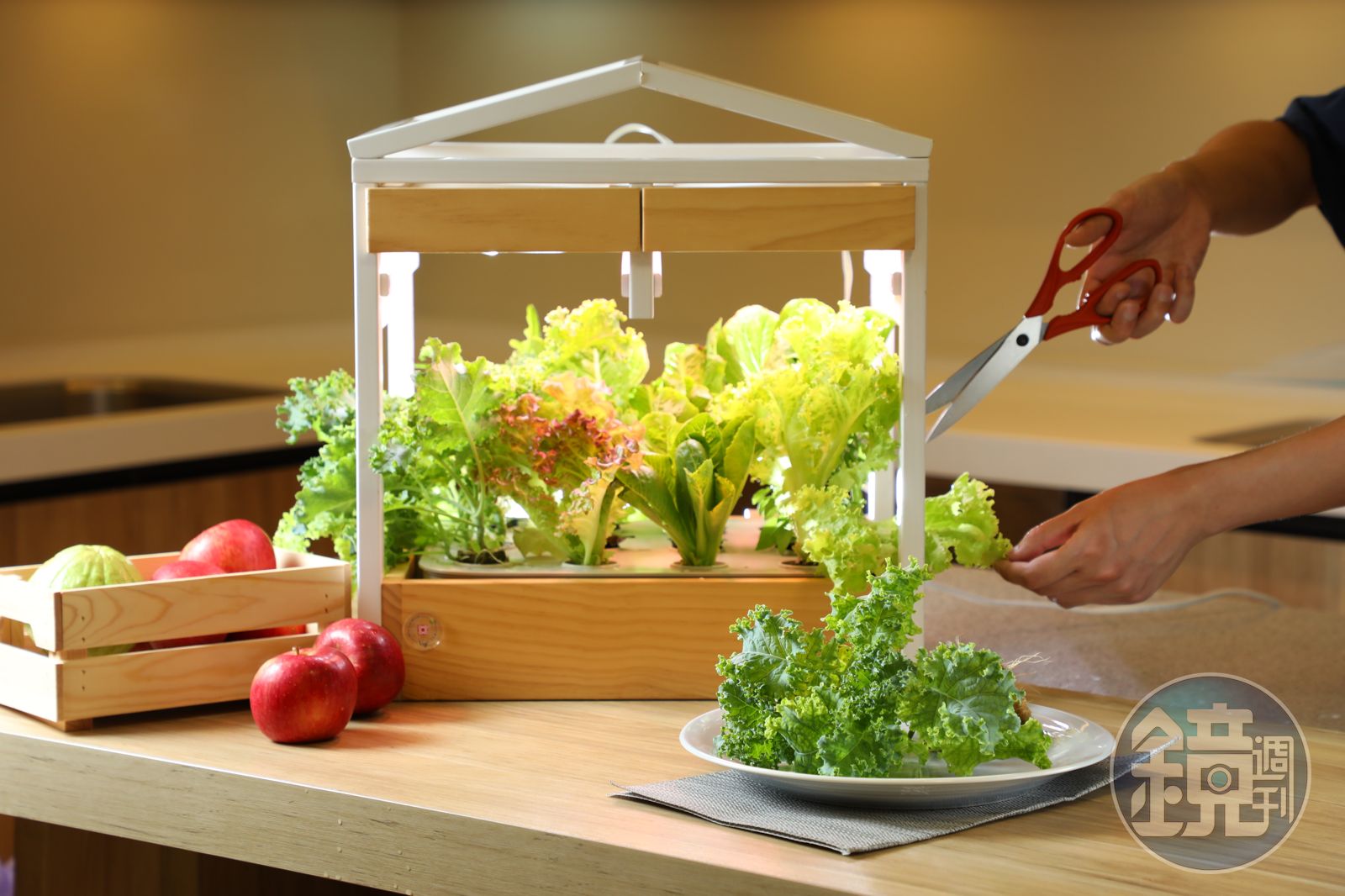 這台高僅49公分的機器,用紐西蘭松木和白色烤漆外框打造出無印風格的簡約外型,一次可栽培12株菜苗,2週可採收一次,每年約可生產288株高經濟價值的蔬菜。