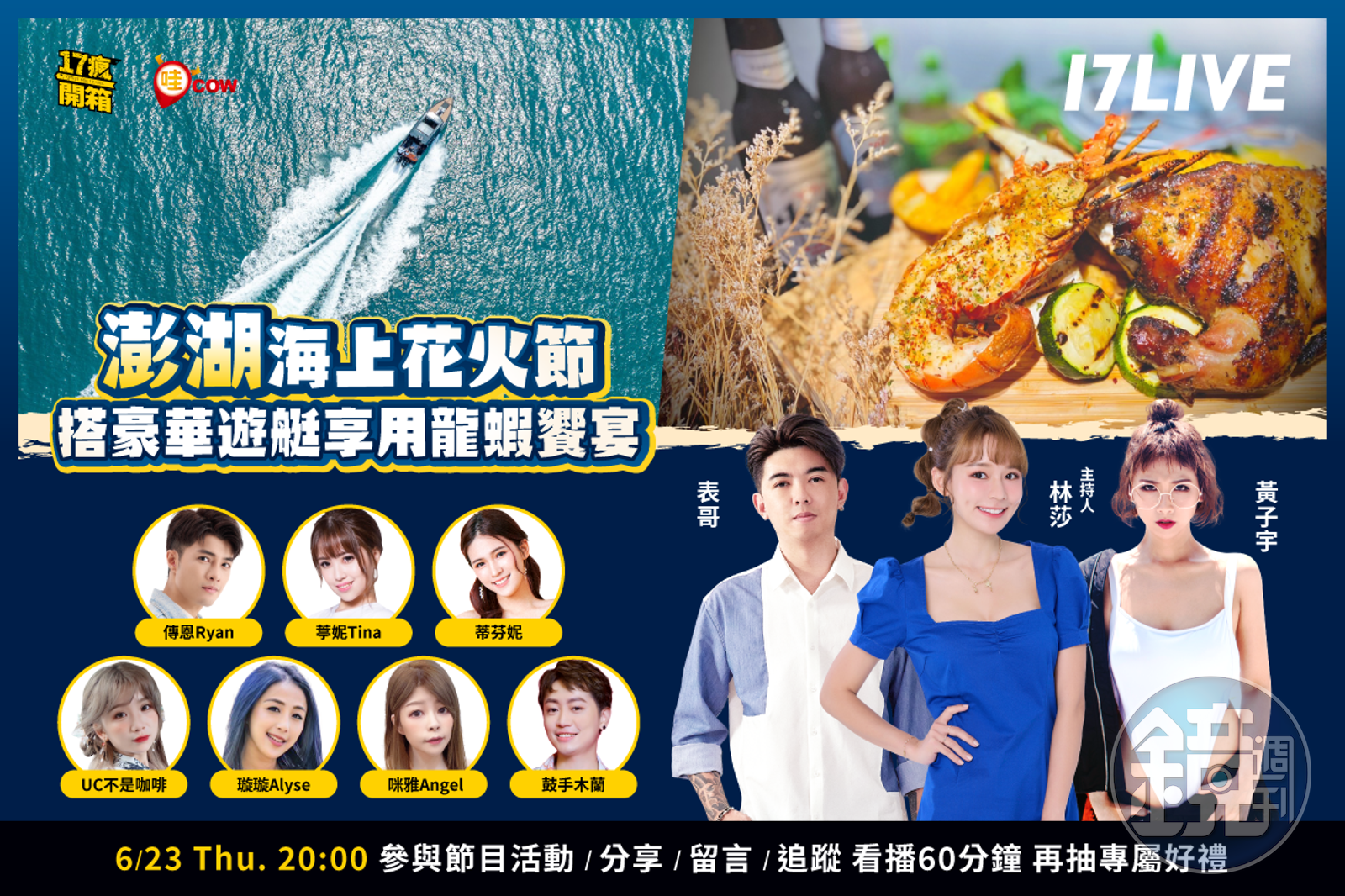 海景第一排享受夢幻花火節後,週末6/25,26兩天下午兩點《17瘋開箱》節目中主持人林莎和黃子宇Amanda、嘎D人辣個表哥、葶妮Tina、蒂芬妮、傳恩Ryan、咪雅Angel、璇璇Alyse、鼓手木蘭、UC不是咖啡等人氣17LIVER將邊玩邊PK對戰帶路多項澎湖有趣活動,例如到青螺外灘的潮間帶體驗澎湖獨有的傳統捕魚法抱墩抓魚、耙貝殼,學自己動手花枝丸DIY以及比基尼水上大戰等,新奇又有難度的抱墩抓魚關卡,DJ圓圓和LIVER俞汝、嘉恩將現身擔任關主把關LIVER們在潮間帶的PK激戰。
