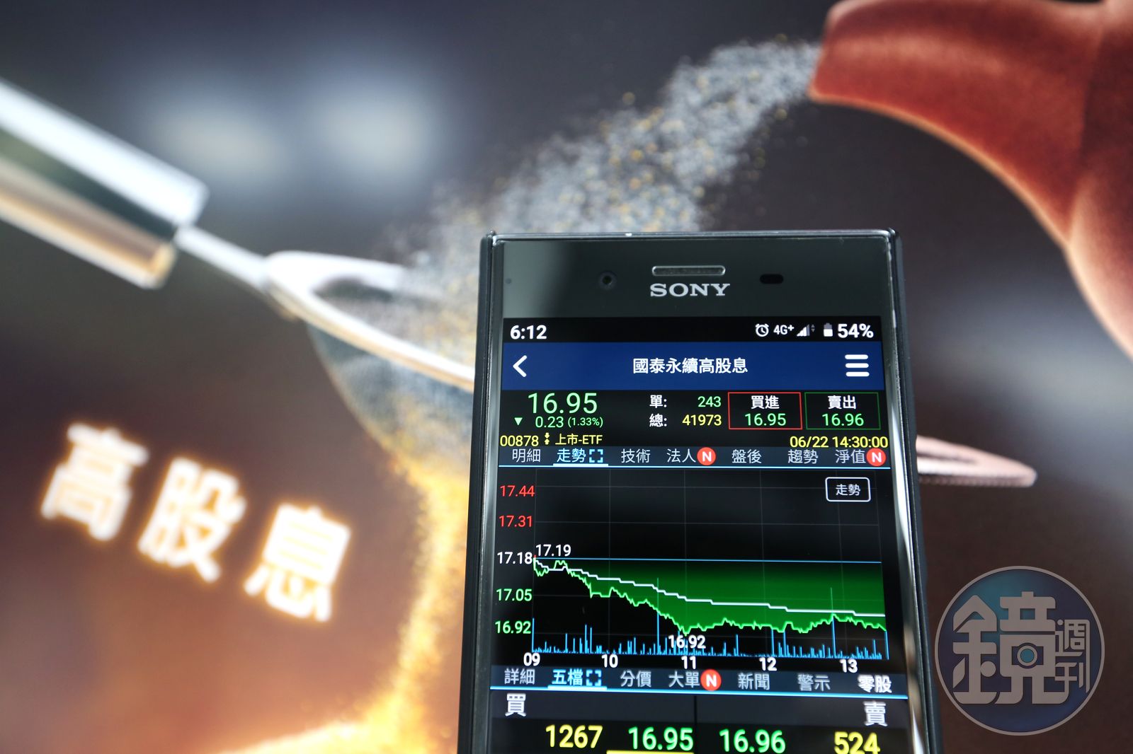 截至今年5月,持有00878的股民總數高達近55萬人,原以為有高股息護體,安啦!但空頭「熊爪」並沒有放過00878,昨(22日)股價還跌破17元整數關卡。
