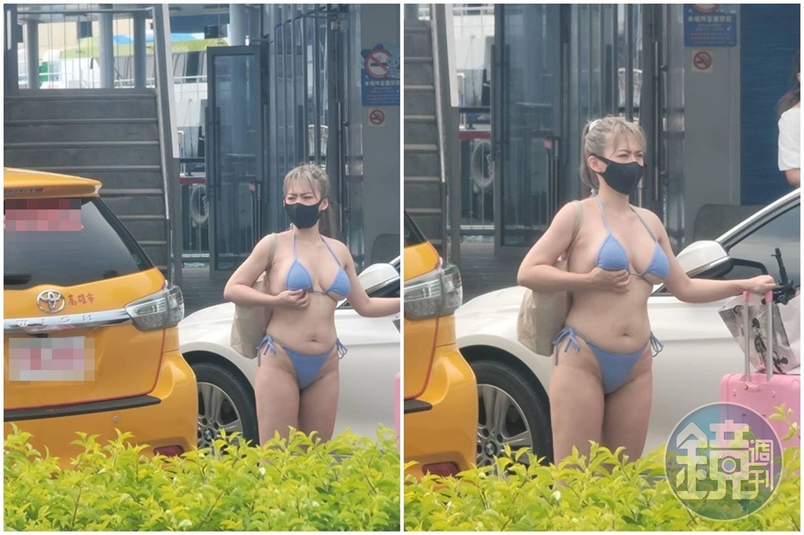 一名男網友今(23日)在臉書社團「爆廢公社公開版」貼出在屏東東港碼頭拍到的照片,一名戴著黑色口罩、身穿粉藍色比基尼的馬尾妹,一手推著行李箱一手揹著包包,在路邊攔車。