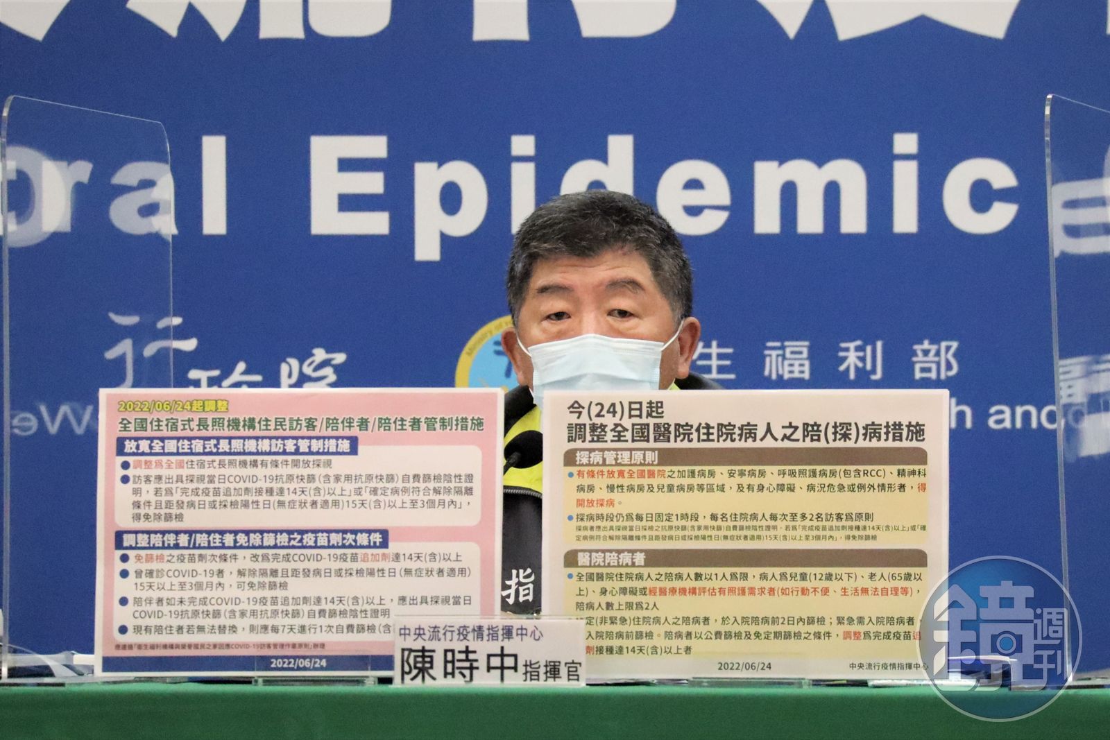 指揮官陳時中表示,原定台北、新北、基隆、桃園、高雄、花蓮等6縣市醫院除例外情形外,暫停探病限制,即日起有條件放寬全國醫院陪、探病管理措施,並調整住院病人經醫療機構評估有照護需求者之陪病人數,及陪病公費篩檢之疫苗劑次條件。