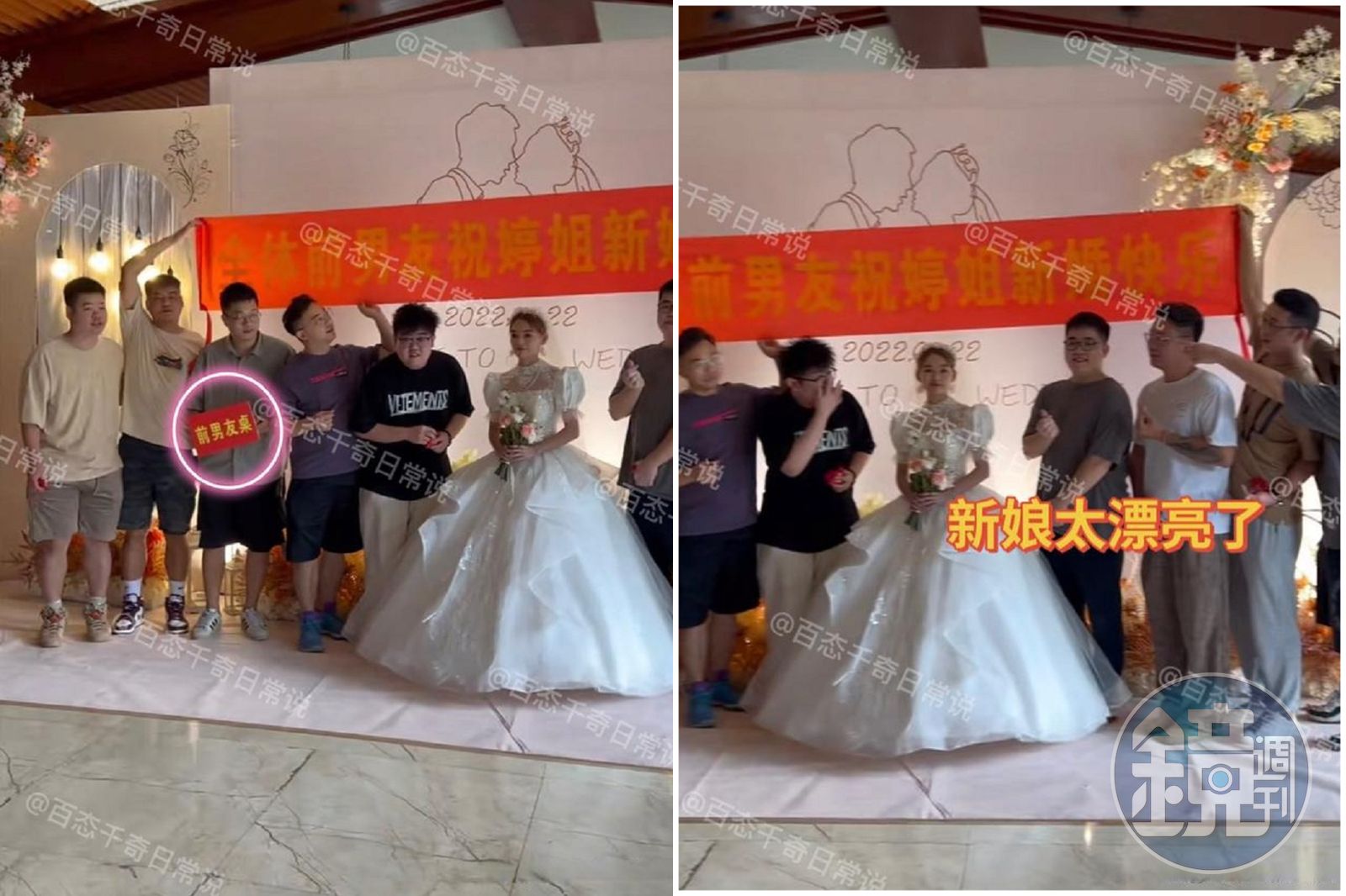 據中國《新浪網》報導,這名正妹在近日舉辦婚禮,但現場卻有「9名前男友」全部上台,站在新娘的兩側圍繞,更拉起紅布條,上面寫著:「全體前男友祝婷姐新婚快樂。」隨後有的男生比愛心,有的男生豎起大拇指,還有一名外貌神似宅男的男子,更是笑開懷。 還有一名男子舉著「前男友桌」的牌子,場面看起來非常熱鬧。
