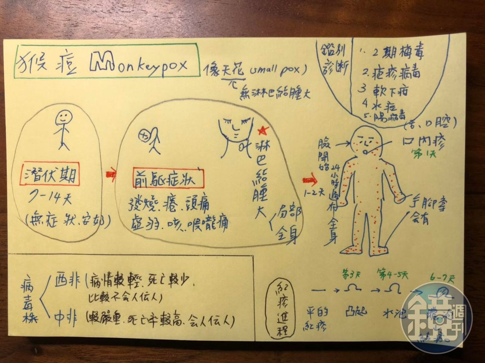 皮膚科醫師蔡逸姍手繪圖片解釋感染猴痘的病程。(翻攝皮膚科蔡逸姍醫師粉專)發布時間:2022.06.26 16:01 臺北時間