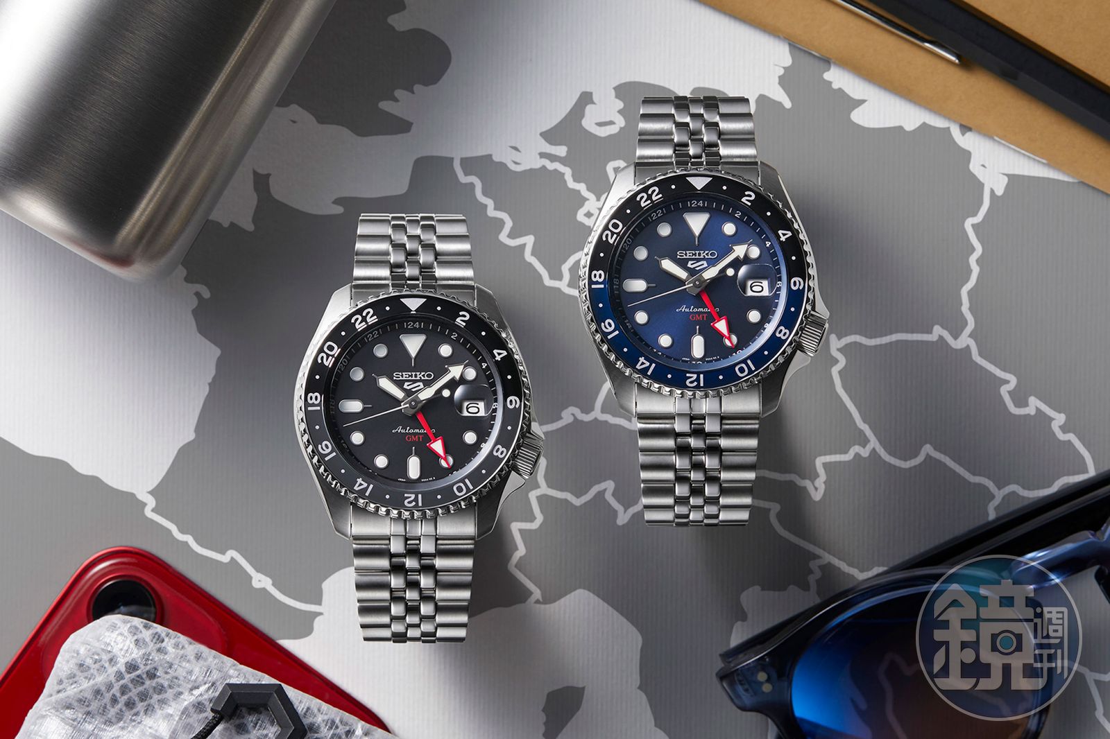 SEIKO 5 Sports GMT是以SEIKO 5 Sports基礎而來,錶徑為42.5mm,裝載的全新4R34自動上鍊機芯,是在4R機芯的基礎下加入GMT功能,也是該系列首度導入這項功能,於此同時還加入雙向旋轉錶圈,讓手錶至多可以指示到三地時間。雙向旋轉錶圈在顏色的處理上也格外用心,將日夜兩個部分用不同的顏色呈現,閱讀性極佳。甚至在日期窗還有加入放大鏡,配上錶款本身的五排鍊帶,不得不說藍黑圈的版本乍看之下還真有幾分勞力士的樣子。