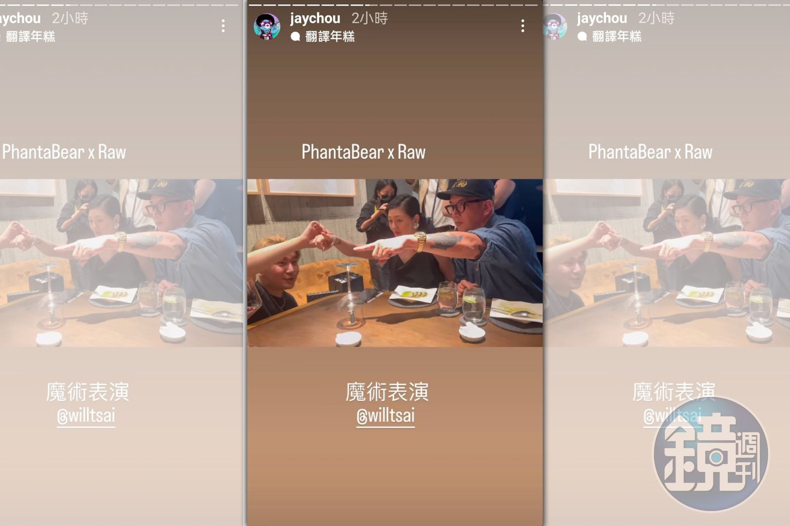 影片中,身穿黑色禮服的大S和藍色襯衫的具俊曄,在魔術師的引導下將手指靠在一起,隔空熄滅了杯子中的燭火,讓兩人驚訝不已。第二則影片則是周杰倫在變魔術,具俊曄身旁的大小S不斷發出驚呼,周杰倫還標註兩名魔術師炫耀說:「讓你們兩位魔術師看看哥在變魔術的時候,觀眾的反應。」