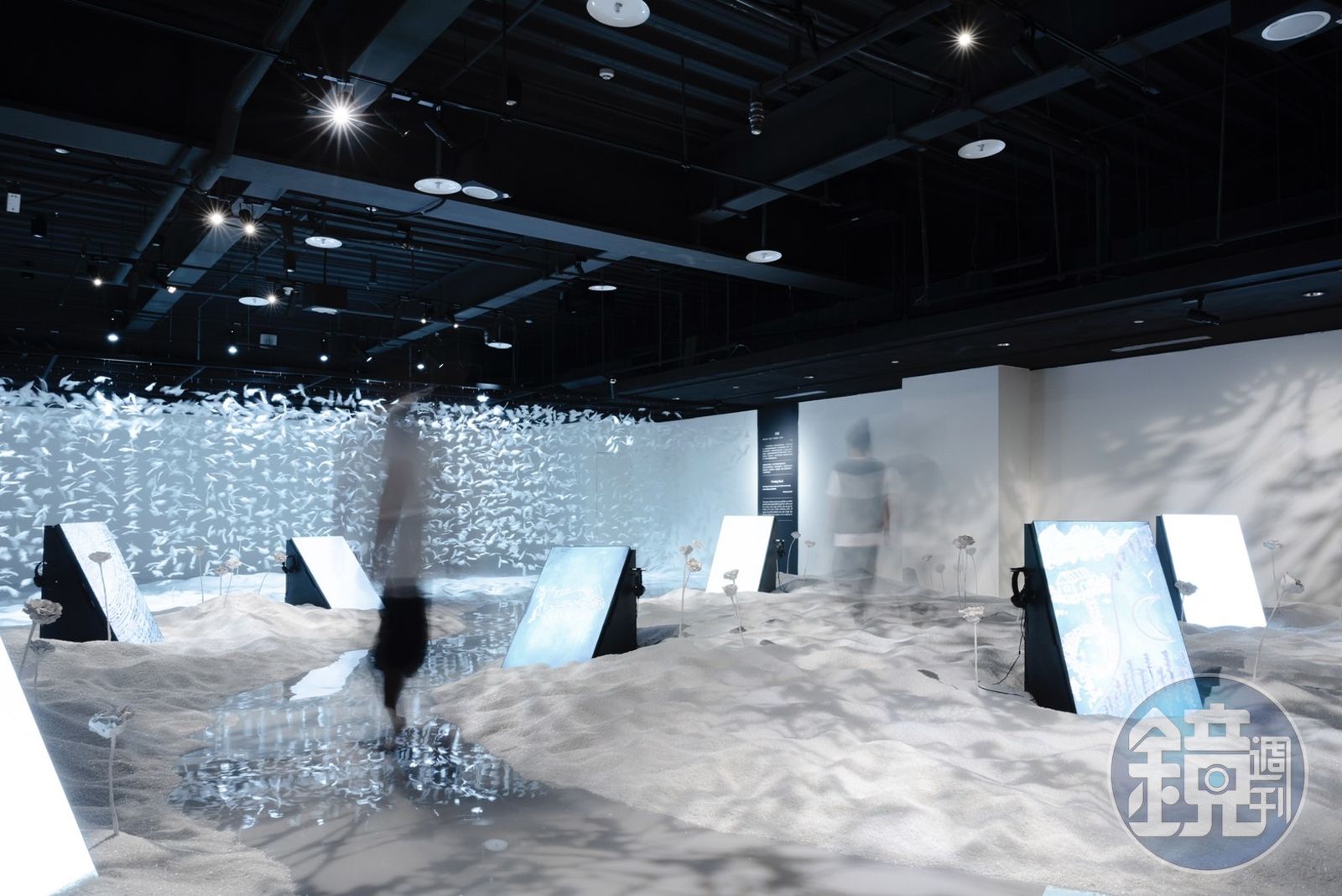 層次分明,色調從黑色到白色,象徵生死與晝夜。其中,內在警鐘展區呈現各宗教死後世界的「審判」元素,作為展場空間的轉折點,從前面未知、黑色的死後世界,慢慢轉換到白色的生命空間,營造出生死、晝夜輪替的空間意象。