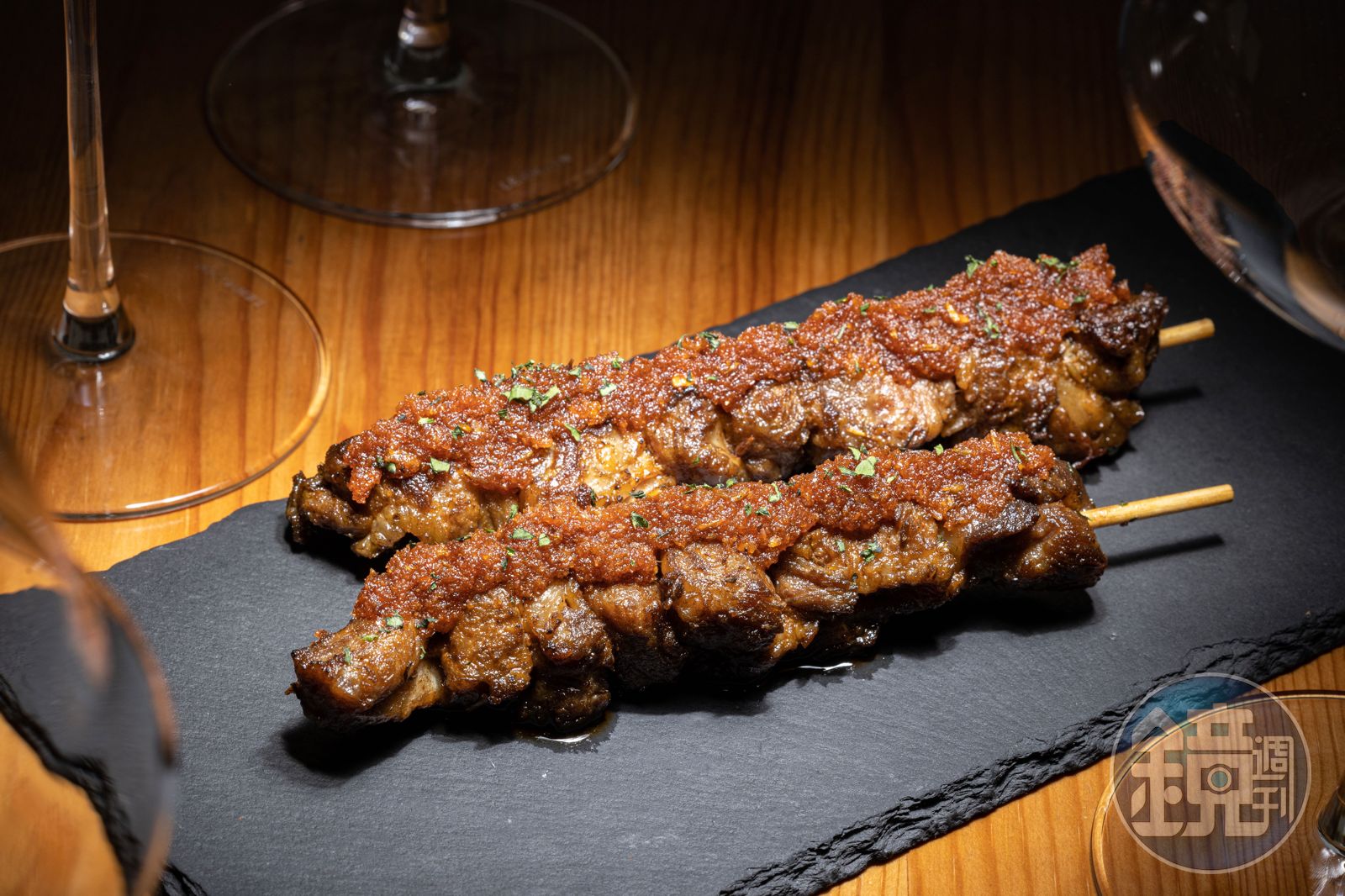 「醋漬鯷魚佐甜椒橄欖(上,95元/個)」的油封甜椒以老奶奶食譜加入許志成的想法改良,多了橄欖鹹味,油潤開胃;「醋漬鯷魚佐白煮蛋與蝦夷蔥(下,110元/個)」吃得到鯷魚本身的肉質口感。「摩爾伊比利豬肋條串佐MOJO醬」肉串以孜然、香草醃製,塗上沙沙的MOJO醬,味道豪邁。(220元/份)「無花果與藍莓醬布拉塔」將布拉塔起司加鮮奶油疊上新鮮無花果,甜美可口。(125元/個)「醋漬鯷魚佐甜椒橄欖」上的甜椒,就是改良自當地老奶奶的食譜,烤到熟透去皮,與甜椒汁、橄欖油,再多加一點橄欖一起油封,醋漬的白色鯷魚不鹹不腥,還嘗得到魚身質地。「摩爾伊比利豬肋條串佐MOJO醬」香料肉串塗上以百里香、雪莉醋、橄欖油及麵包碎打成的Mojo醬,顏色像味噌,微沙口感讓人想起沙茶。