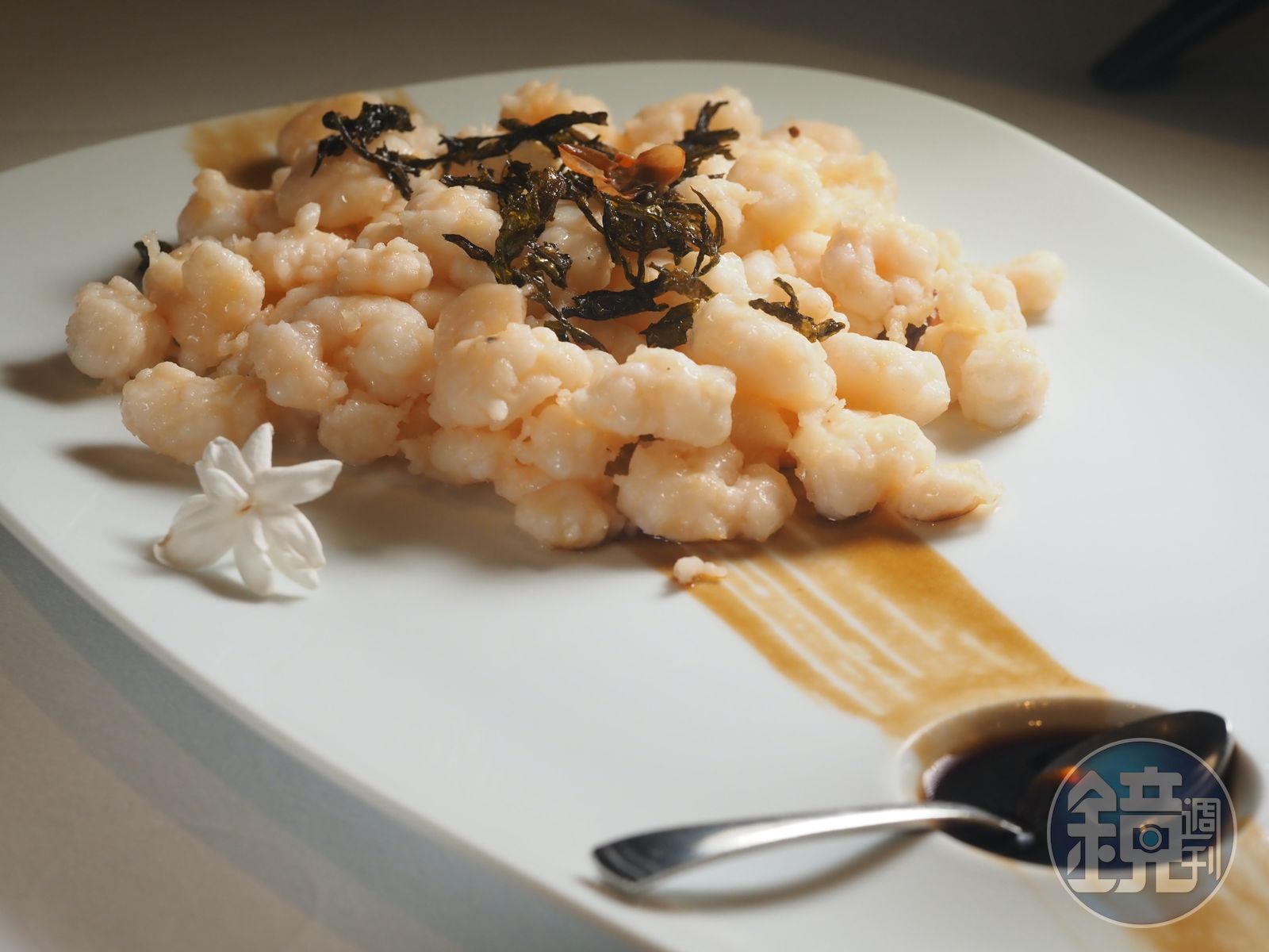 宗哥最喜歡的一道是「茉莉茶香炒蝦仁」,他先用黃酒低溫浸漬桃園來的茉莉,把花香移入酒中,為了讓成色漂亮,選用色澤較淺的花雕勾兌米酒,浸好的茉莉酒用於嗆鍋,把花香包裹在脆爽河蝦仁外,搭配酥炸的包種茶葉,入口時不會有像手搖杯般大鳴大放的花茶味,而是在尾韻飄出一絲淡雅幽微的清香。