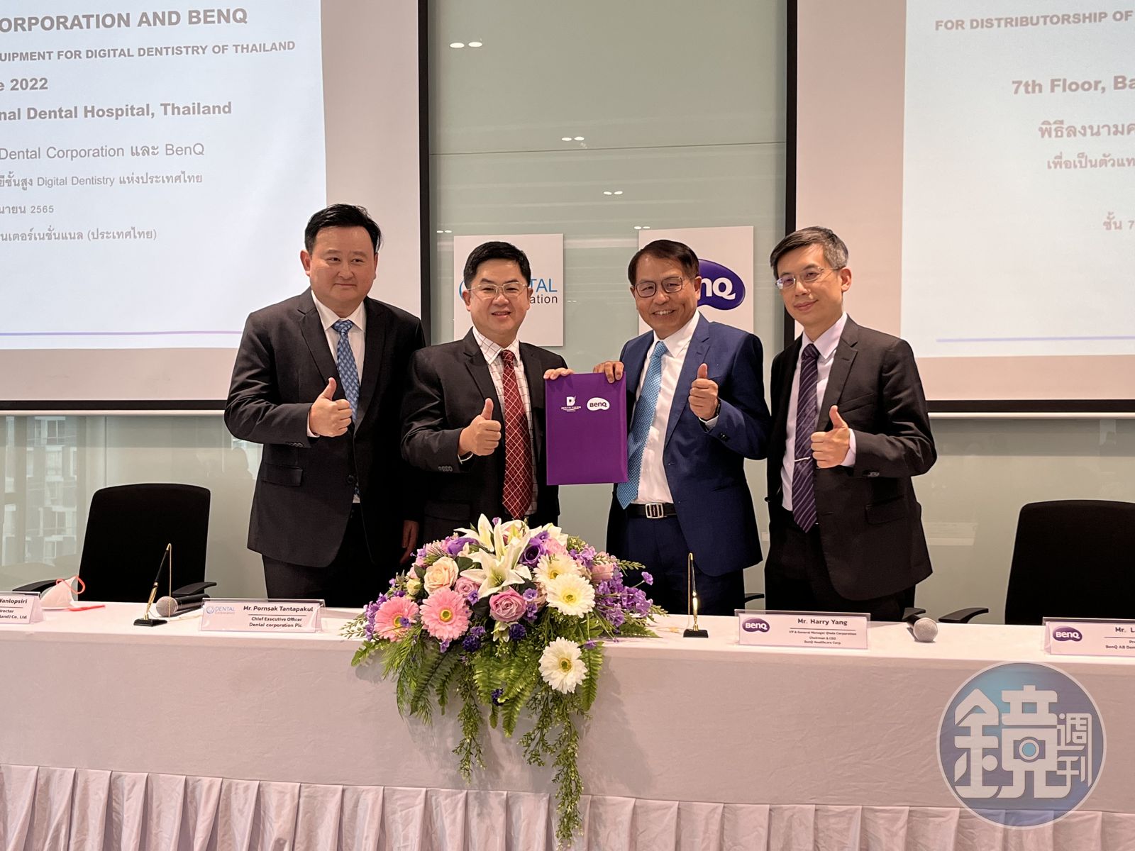 明基三豐副董事長楊宏培、明基口腔總經理林家弘親赴泰國與會,顯示集團高度重視泰國數位牙科市場,以及積極拓展東南亞業務的決心。D-Company則由執行長Dr. PORNSAK TANTAPAKUL與總經理Mr. Wichu Wanwansiri親自出席簽約儀式,泰國當地媒體近20位出席採訪。此次代理合約及合作備忘錄簽署結合D-Company在泰國牙科市場的牙科專業團隊與業務實力,以及明基佳世達集團在數位牙科醫療的技術開發與品牌實力,此合作將有助於明基佳世達集團擴大在數位牙科產品的影響力。