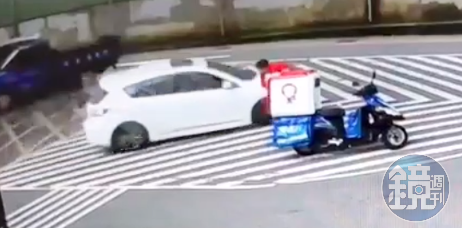 白色轎車為躲避警察追捕,差點撞快遞上外送員。(翻攝爆料公社)發布時間:2022.07.01 16:08 臺北時間