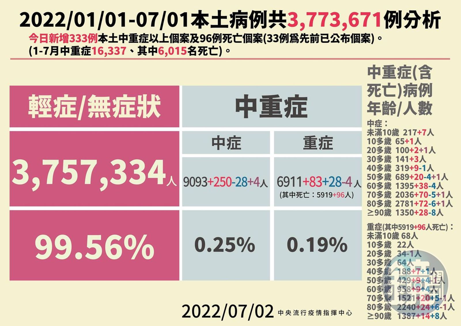 而今日新增96例本土病例死亡個案,為61例男性、35例女性,年齡介於40多歲至90多歲以上,皆屬重度感染個案、90例具慢性病史、61例未接種3劑COVID-19疫苗。確診日介於5月2日至6月29日,死亡日期介於6月15日至6月29日。