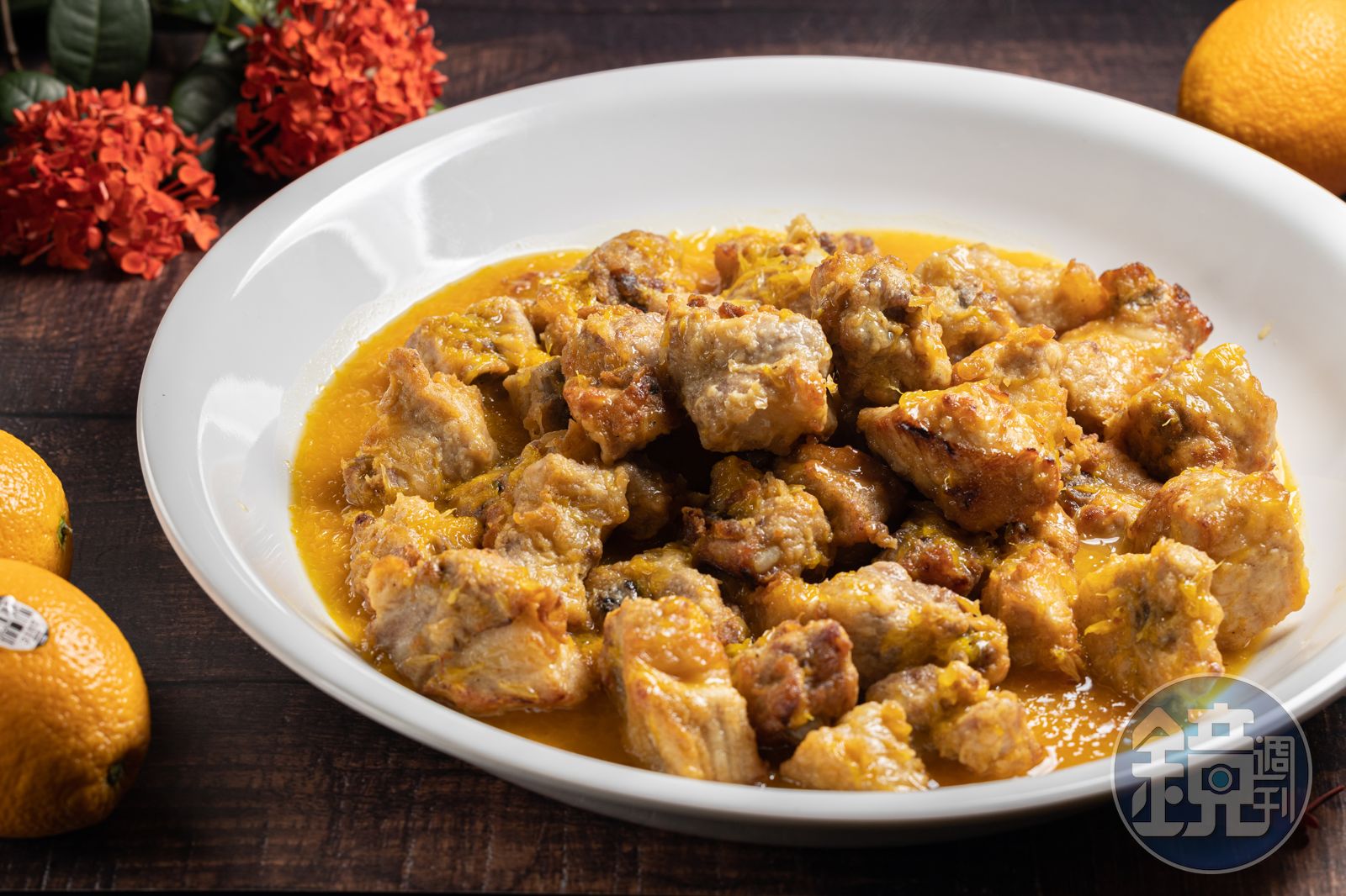 另起一鍋,橙汁白醋糖及橙肉煮成醬汁,汁一黏稠,將烤箱中焗脆的子排取出放入鍋中,稍一兜勻,加一匙蜂蜜,收汁即可起鍋,家常料理,國宴風味。這道國宴菜一直是圓山飯店金龍廳招牌,至今仍受歡迎。