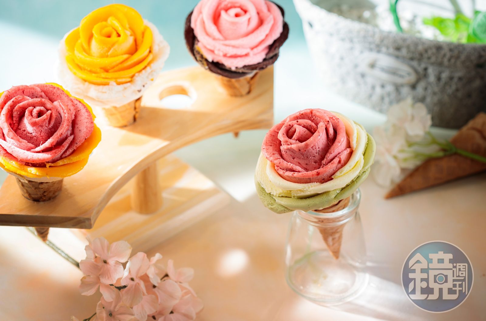 「六月三十」本季選用高雄大樹莊記農場的玉荷包來製作雪酪。造型吸睛的「玫瑰冰淇淋」最多可一次嘗到3種口味。(130~150元/支)為了彰顯水果本色,張祐誠不加半滴水,並特意將荔枝上略帶澀味的皮膜保留,製成冰淇淋後仍可咬到一點口感,並在製程中擠入檸檬汁,讓風味更清新。