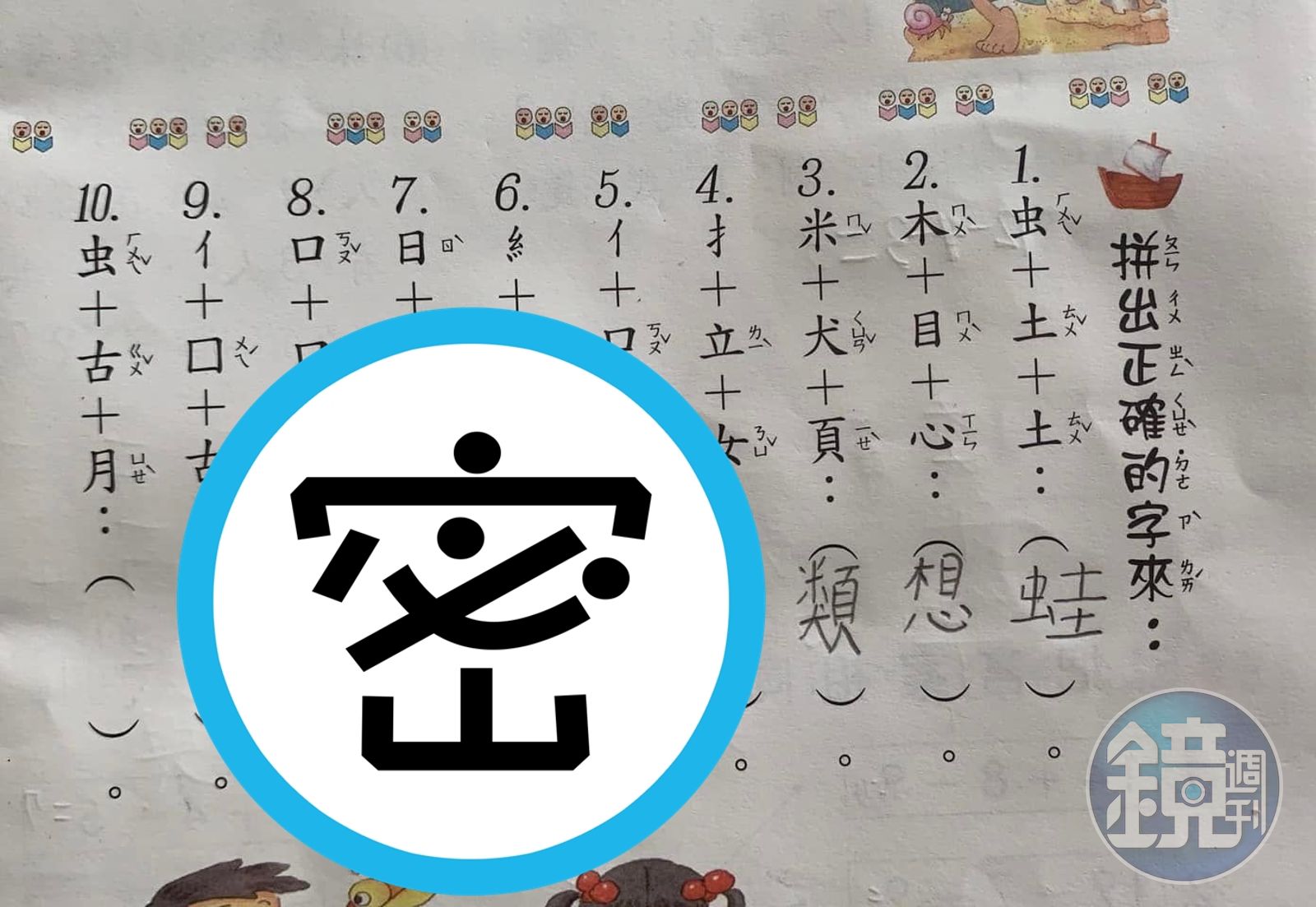 從原po所曬出的照片中,可見小孩子共答對「蛙」「想」「類」「哭」4題,其他「接」「保」「線」「時」「個」全都拼成錯誤的文字,最後一題「蝴」也未作答,這讓原po傻眼表示,「我覺得能寫成這樣也是蠻厲害的,雖然我剛看到的時候差點吐血」。
