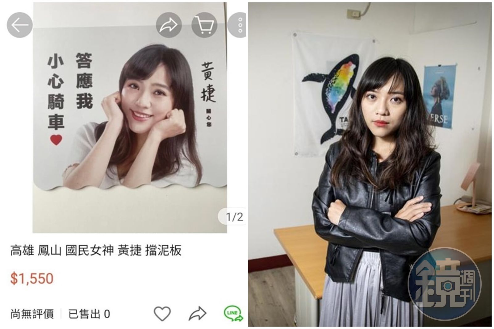 為備戰年底九合一地方選戰,黃捷推出多款周邊小物發起募款,卻收到熱情民眾告知,印有她肖像的機車擋泥板竟被放上蝦皮拍賣,賣家還不只一位,令她十分不滿「是誰這麼過分啦!」