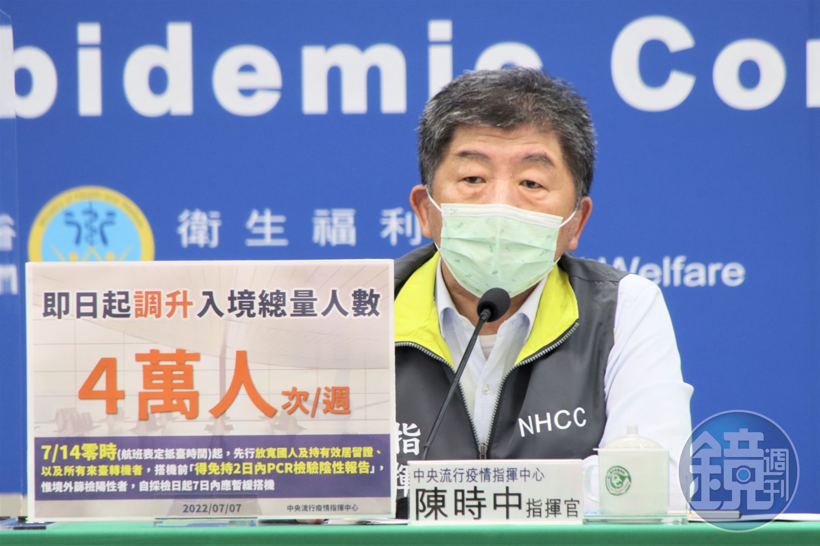 同時,有關來台旅客應持有表定航班時間搭機前2日內PCR報告,自7月14日零時(航班表定抵台時間)起,先行放寬國人及持有效居留證、以及所有來台轉機者,搭機前得免持該項報告,惟境外篩檢陽性者,自採檢日起7日內應暫緩搭機,以維護航空及社區防疫安全;指揮中心將持續監測境外變異株及旅客入境篩檢確診情形等,滾動檢討,並於必要時修正重啟此措施。