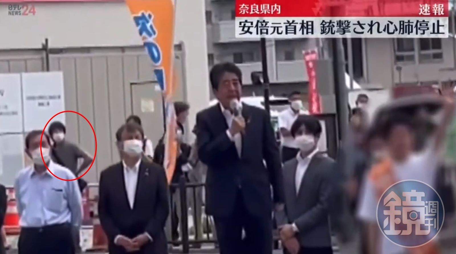原先日媒報導,山上徹也從安倍晉三身後以霰彈槍連開2槍,擊中左胸;經過奈良警方更正,已更改為手槍,目前安倍緊急送醫,心肺停止無意識。 現場目擊者指出,山下約站在距離安倍3-10公尺的範圍,過不久就聽到槍聲。 從網路上流傳的影片中可見,安倍晉三在演講時,右後方的山上徹也不時東張西望,甚至跟著群眾的節奏拍手並潛伏在安倍身後,似乎很難察覺出他即將行凶。