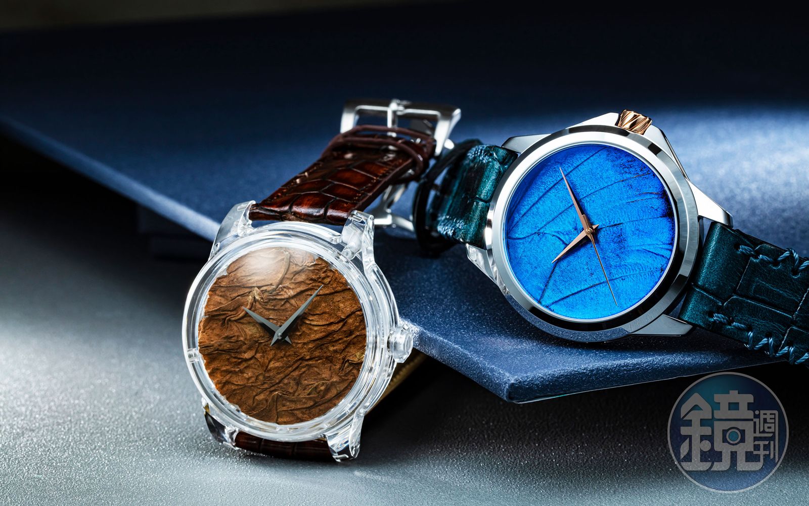 同樣的設計邏輯,Son of Earth Tobacco系列則是以菸草葉來作為面盤的材料,在ARTYA的精挑細選下,菸草葉的特殊紋路與色調,加上它細微立體的層次,乍看之下有著猶如礦石般的粗獷風格。這款Son of Earth Tobacco Crystal腕錶更是使用起藍寶石水晶材質錶殼,通透的效果能夠全方位欣賞菸草葉面盤的波瀾起伏,給人強烈的視覺感官。