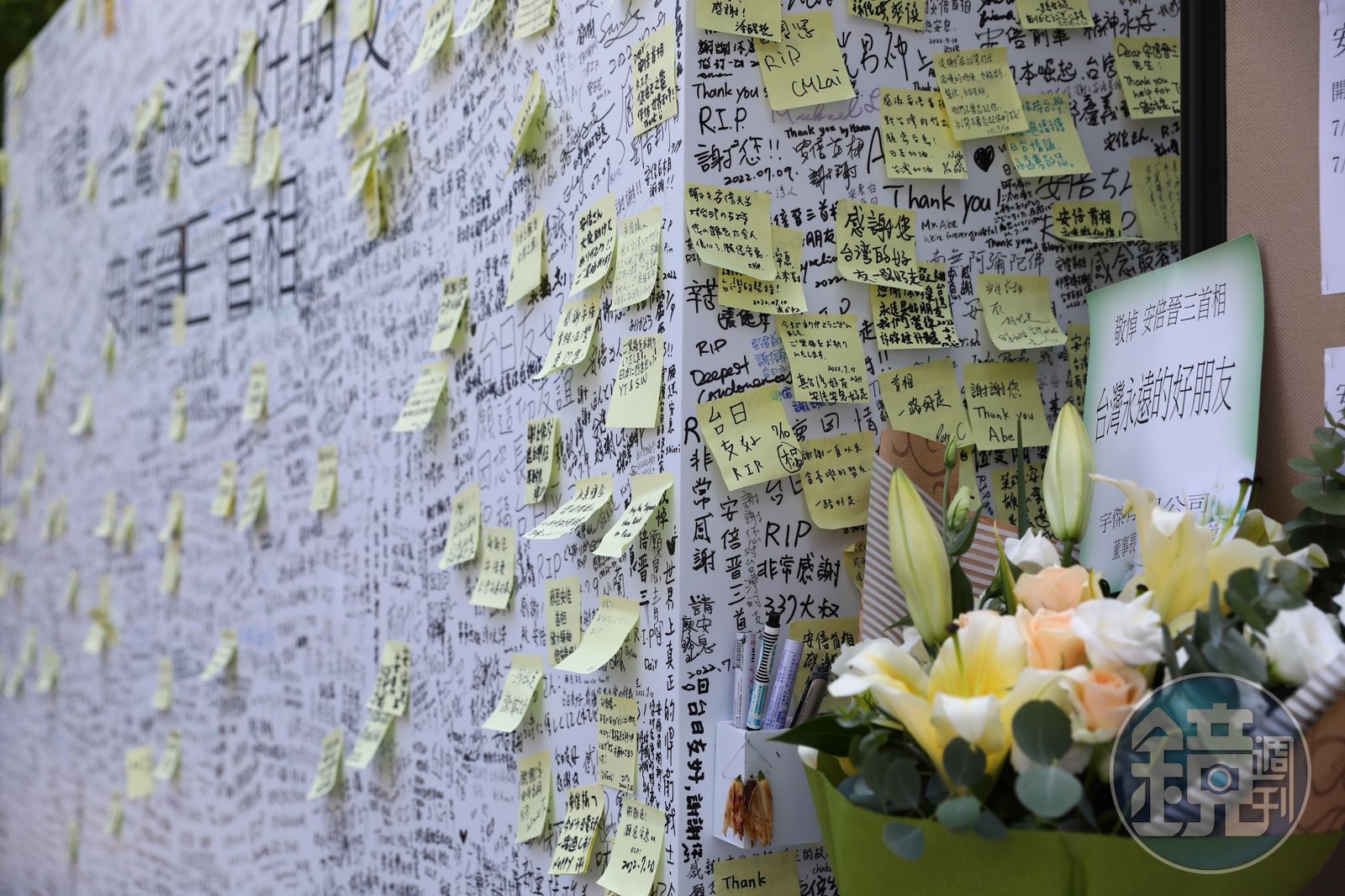 日本前首相安倍晉三不幸中彈身亡,許多民眾於日本台灣交流協會的追思牆上留下感念字句。發布時間:2022.07.11 11:16 臺北時間