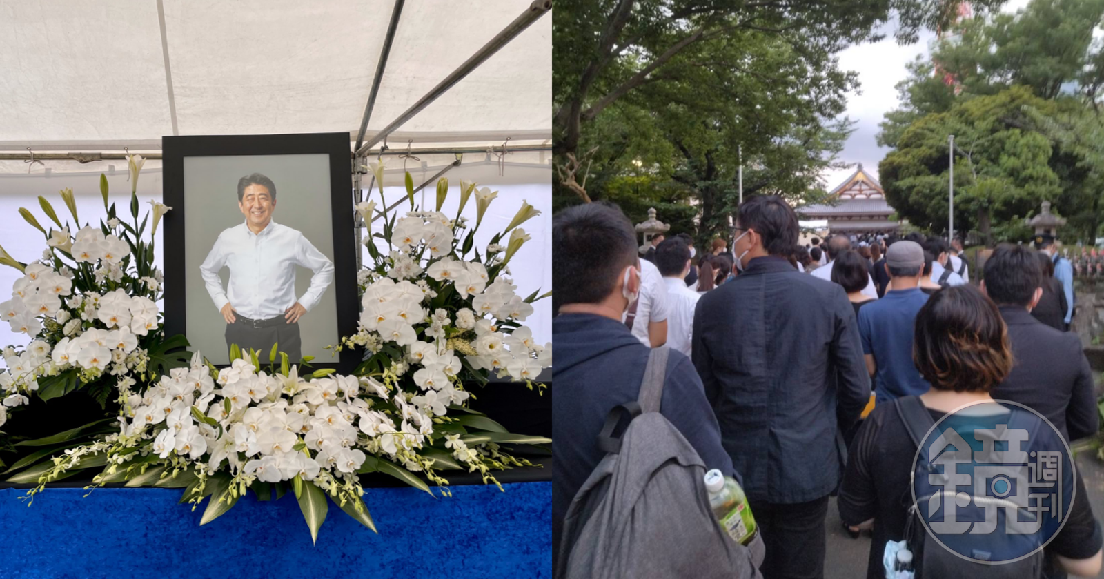 花台上擺著安倍的照片,他身穿白襯衫、雙手叉腰,臉上露出和藹的笑容,今日一早就有許多民眾前往增上寺為安倍獻花,做最後的告別,清和政策研究會(通稱「安倍派」)指出,包含一般人在內的話,有2,500人參與。一名來自新宿區的7旬男子受日媒訪問時,表示對事發當時安倍身邊的警備反應感到失望,直言若這件事發生在美國或許就能得救。