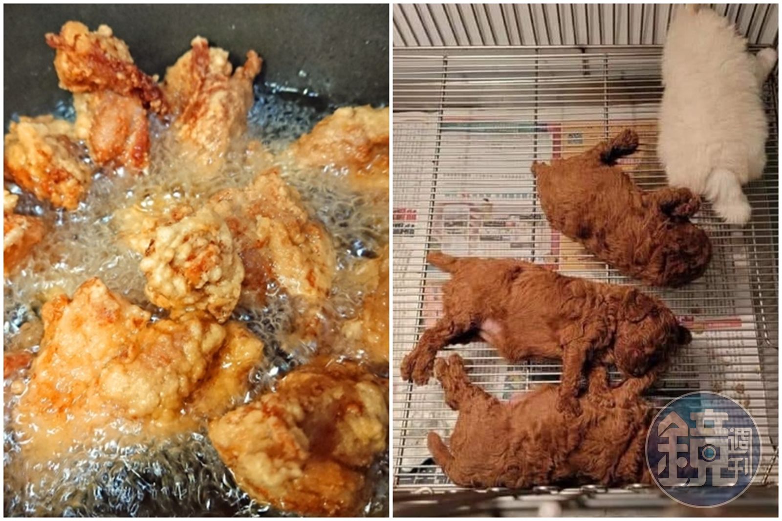 一名網友在臉書社團「爆廢公社公開版」分享一張照片並寫下:「原本以為是炸雞,直到我看見那隻白毛。」照片中有3隻紅貴賓和1隻全身白色毛髮的狗狗躺在籠子裡睡覺,紅貴賓褐色捲捲的毛,加上躺的姿勢,看起來就跟「炸雞」十分相似,也難怪大家看一眼就認錯。