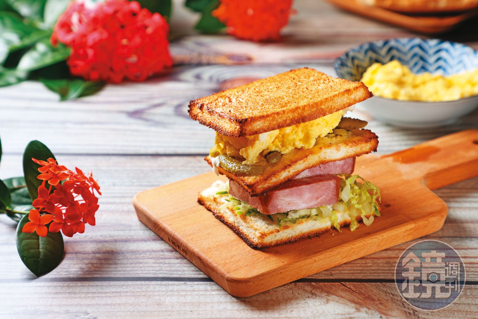 材料:白吐司3片、柴窯火腿切厚片、蛋3顆、鮮奶1盒、奶油1塊、美奶滋適量、酸黃瓜片適量、小黃瓜絲適量、蘿蔓生菜絲適量、鹽適量。