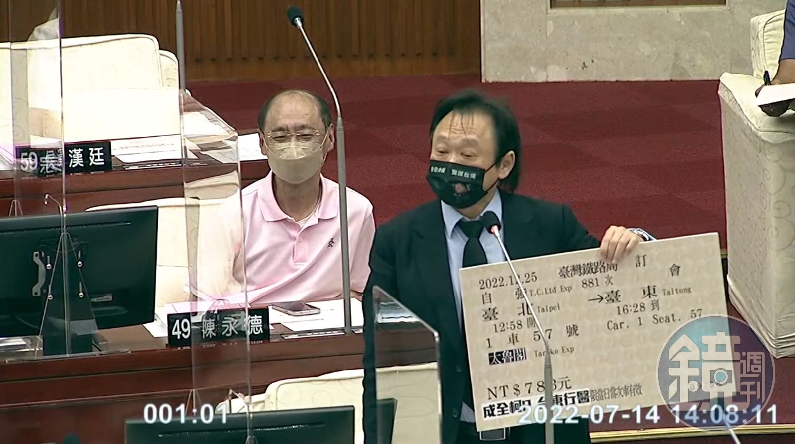王世堅還說,這張車票上面藏有「數字密碼」,要柯文哲好好解讀看看。據王世堅秀出的車票字卡,上頭的車次編號為「881次」,應為諧音「拜拜」;而座位則為「1車57號」,應指柯文哲自稱「智商157」。