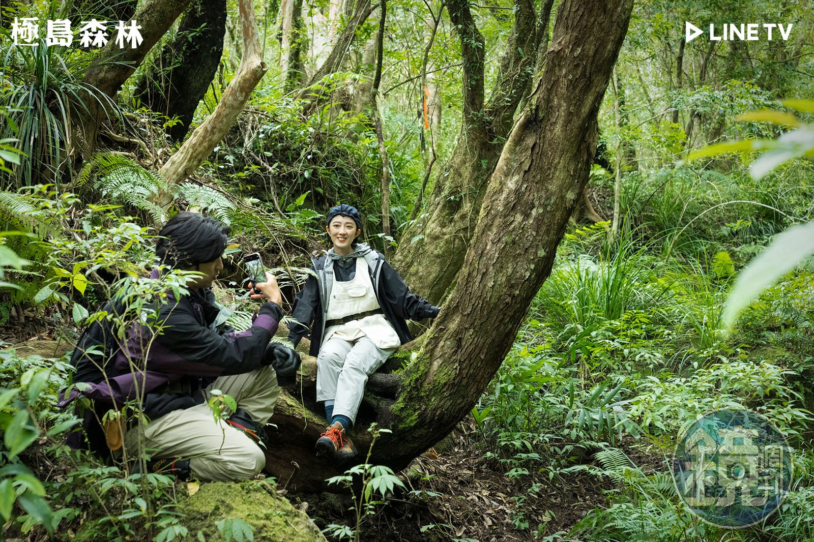 陳柏霖(中)與桂綸鎂穿戴安全裝扮出外景。(LINE TV提供)回想當時,桂綸鎂說:「其實並不害怕,因為知道有繩索保護,但是當自己一直滑落的時候會覺得怎麼辦,靠自己的能力似乎到不了,所以那一刻也對獵人的身份更加的尊敬,我覺得他們是一直在擁抱樹,跟森林是朋友的感覺。」而當陳柏霖站上樹頭的那一刻,也讚嘆這景色就像是「空拍機視角」,俯瞰山林的他們,雙雙享受著森林帶來的美好。
