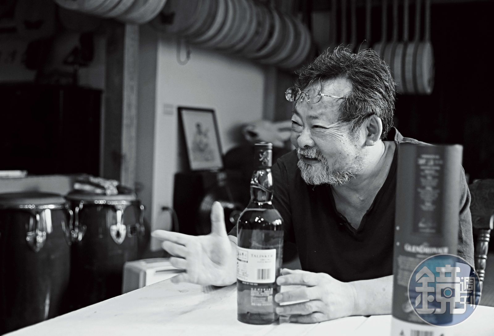 今年66歲的陳明章,還是招牌老樣子,戴著橢圓眼鏡,留著絡腮鬍,穿著寬大的麻質布衣和短褲。只是鬍子頭髮又白了一點,像是比較愛藝術的肯德基爺爺。他喝了點酒後,講話速度非常快。可能因為太快了,常常下一個詞句還來不及出現在他腦中,只得暫時用「嘿啦嘿啦」「你了解我的意思嘸?」「著嘸(對不對)」來填塞空白。真的找不到適當的話語,他就會起身拿月琴來示範,好像樂器才是他的翻譯。