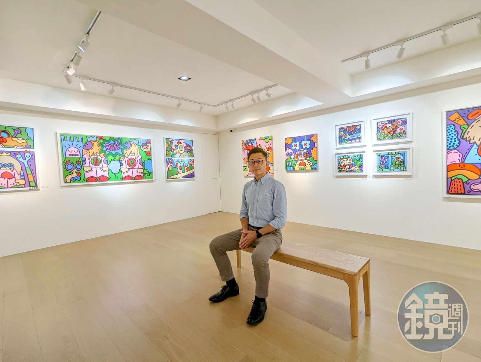 新中街寧靜的巷子裡,落地玻璃窗透出明亮溫暖的光線,架上展示著鼎鼎大名的庫柏力克熊,讓我忍不住往裡頭探去。這一探,更勾起我的興趣,幾幅線條大方、色彩飽和的畫作,畫裡的角色童趣如兒時繪本,鮮活了這個炙熱難耐的夏日午後。