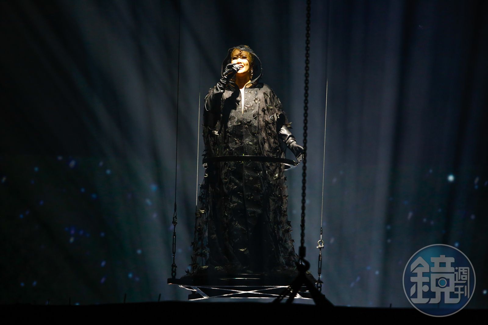 A-Lin脫下斗篷,「蝴蝶馬甲螢光女戰士裝」深V前後都開的勁裝造型現身,頭頂上金黃色俐落激短髮讓粉絲眼睛為之一亮,相較過去長髮優雅造型讓人耳目一新。一連唱跳4首勁歌後稍稍停了下來,她開玩笑的表示年紀大了「肺有一點爛」,也在全場歌迷前許願,希望可以再多當幾年唱跳歌手,笑翻現場所有粉絲。