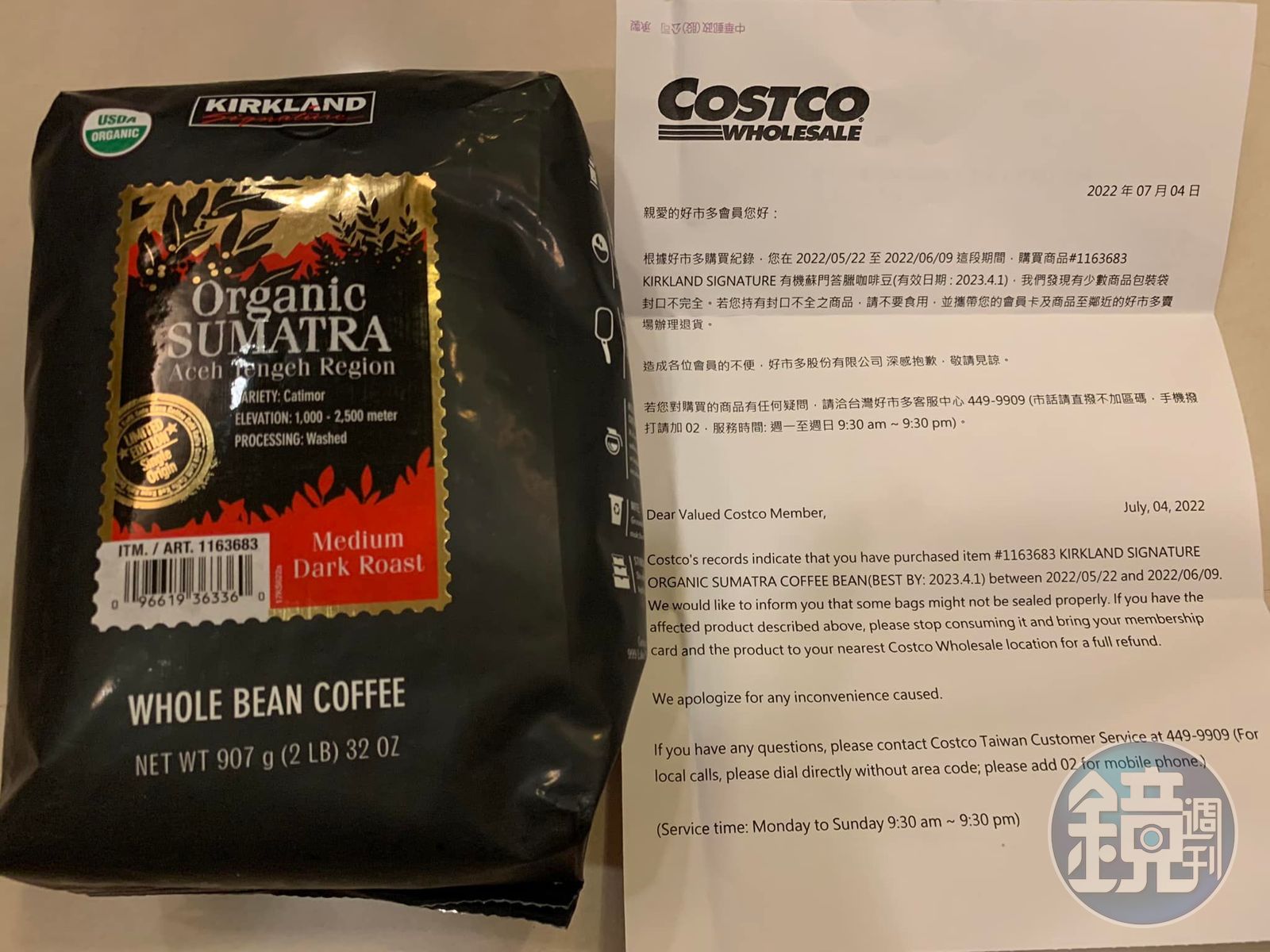 一名女網友在臉書社團「Costco好市多 商品經驗老實說」分享,她最近收到好市多商品異常通知,信中寫道,根據她的會員購買紀錄,她曾在5月22日至6月9日這段期間購買「Kirkland Signature有機蘇門答臘咖啡豆」,然而好市多發現,有少數商品包裝袋封口不完全,因此通知會員「若您持有封口不全之商品,請不要食用,並攜帶您的會員卡及商品至鄰近的好市多賣場辦理退貨。」