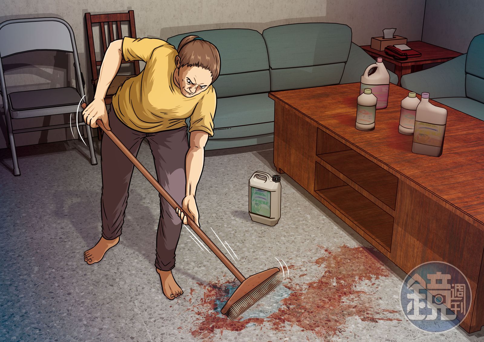 確認對方死亡後,為清洗血跡,並防止大衛返家後發覺,愛彌亞先將屍體拖到放置衣物與雜物的客房牆角,再以衣櫥擋住屍體,接著簡單清理現場,直到隔天中午才出外購買洗潔劑、手套、大型黑色塑膠袋及膠帶。