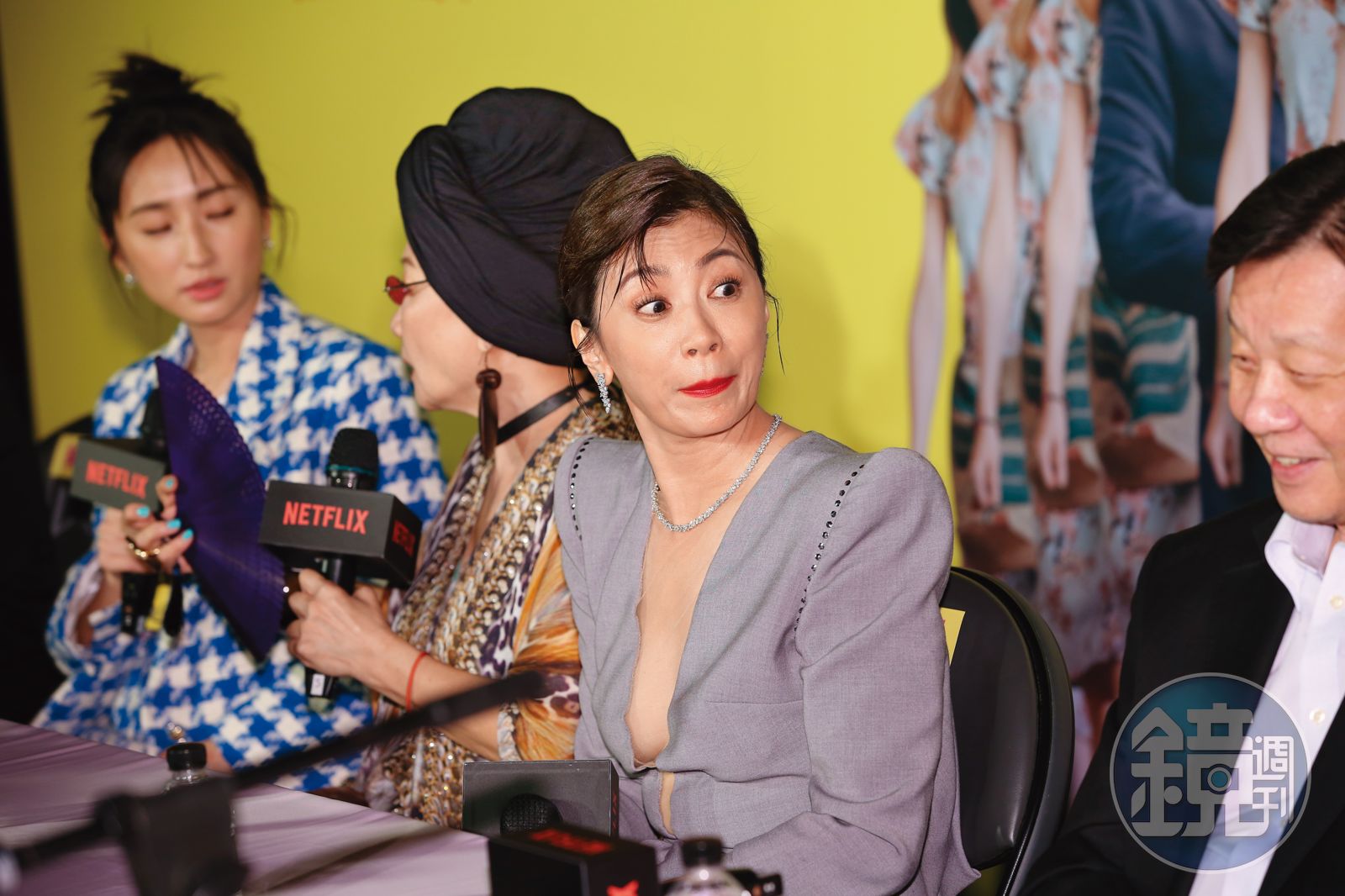 賈靜雯(右起)、比莉和柯佳嬿現身記者會,確認一下Bra有沒有側漏。(拿放大鏡檢查)曾莞婷(中)在戲中飾演肉食女,有猛男伴遊,瞧她一臉陶醉、心花朵朵開。(轉圈) 更新時間|2023.09.12 20:43 臺北時間
