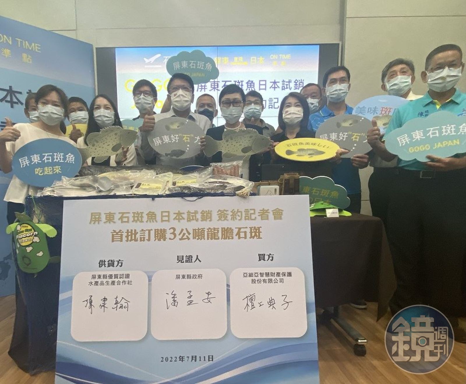 屏縣府11日舉行簽約記者會,由供貨商「屏東縣優質認證水產品生產合作社」、買主「亞細亞智慧財產保護股份有限公司」及縣長潘孟安擔任見證人,三方簽訂首批試銷訂單,試採購3公噸龍膽石斑,測試日本國內市場的接受程度,之後還會再有30公噸的活魚運送到日本,進一步拓展對日輸入石斑魚的機會。