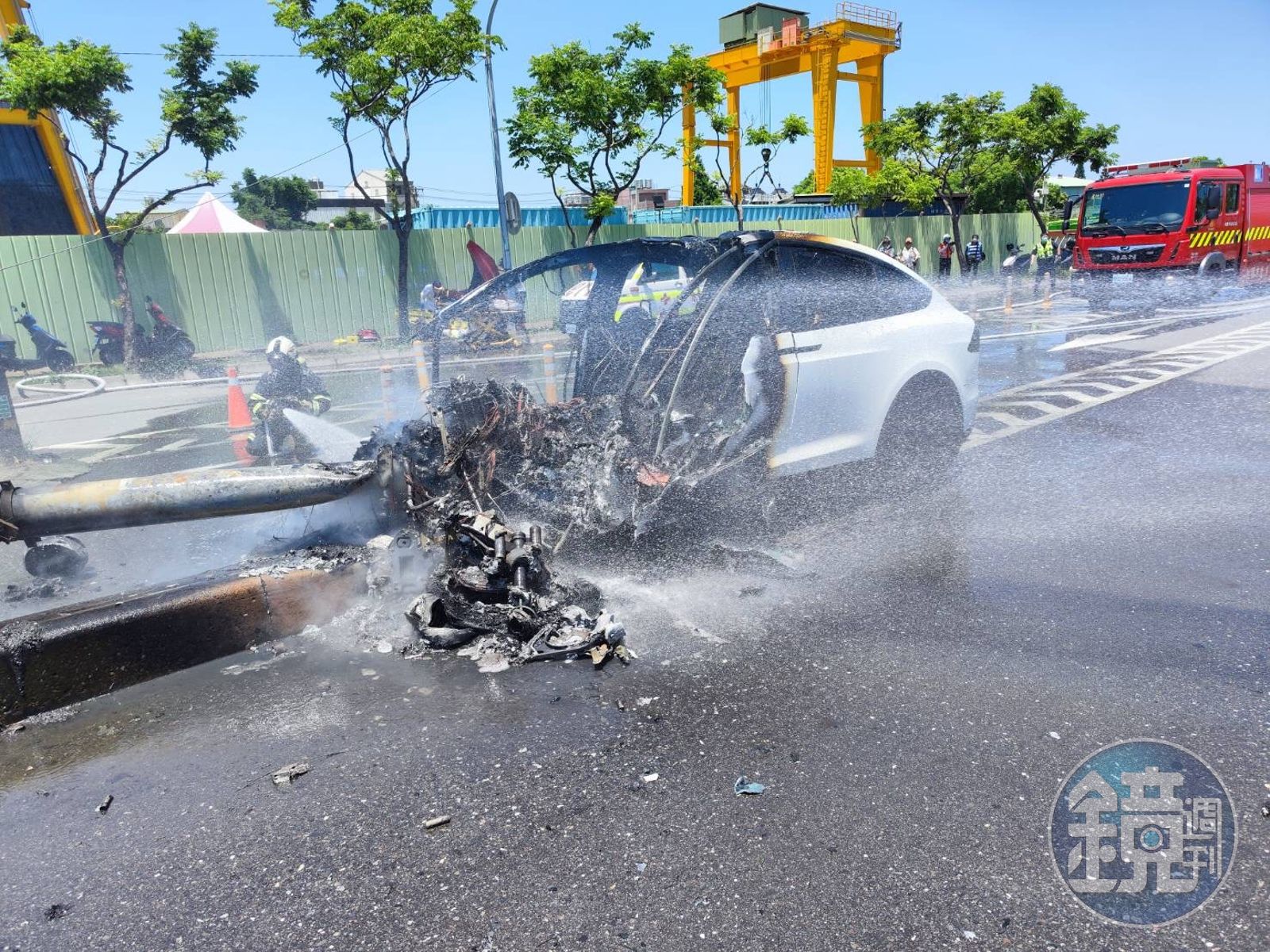 藝人林志穎的特斯拉座車,自撞機車分隔島後起火,車頭全毀。(消防局提供)發布時間:2022.07.22 14:20 臺北時間