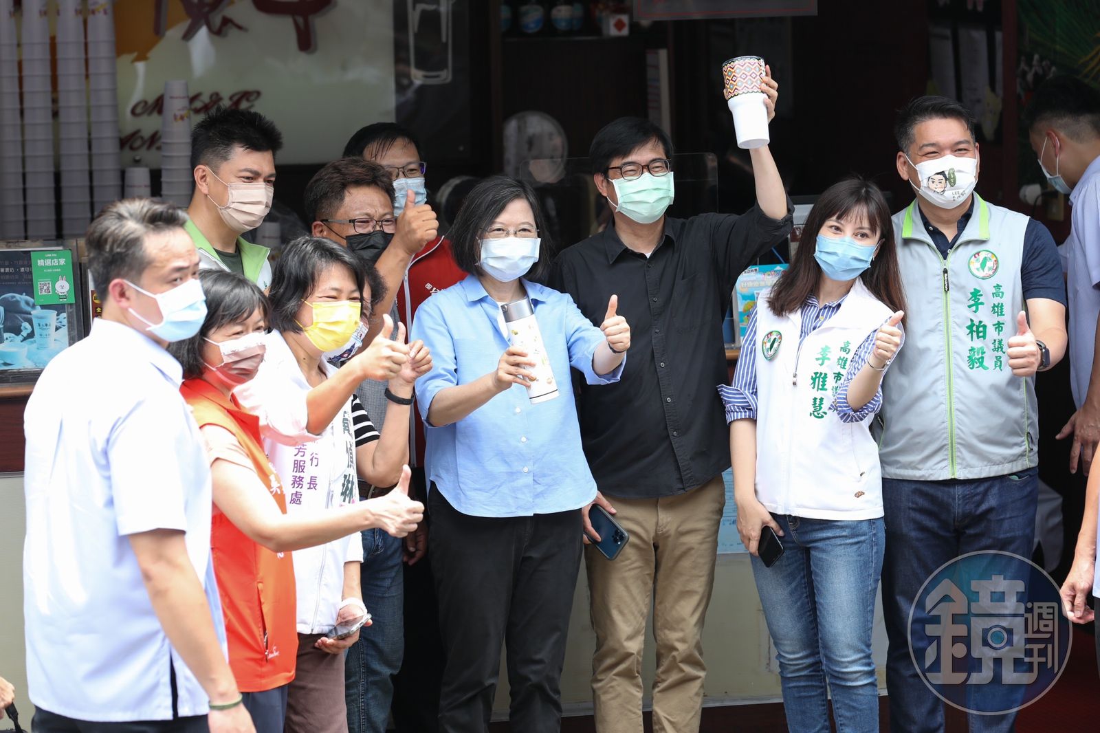 總統蔡英文今(22日)南下高雄跑行程,上午先到中山大學「半導體及重點科技研究學院」揭牌典禮後,市長陳其邁陪同前往楠梓區右昌元帥府參拜,由於近日全台天氣炎熱,頻飆破高溫紀錄,蔡英文也忍不住揪陳其邁一起買手搖飲消暑一番。