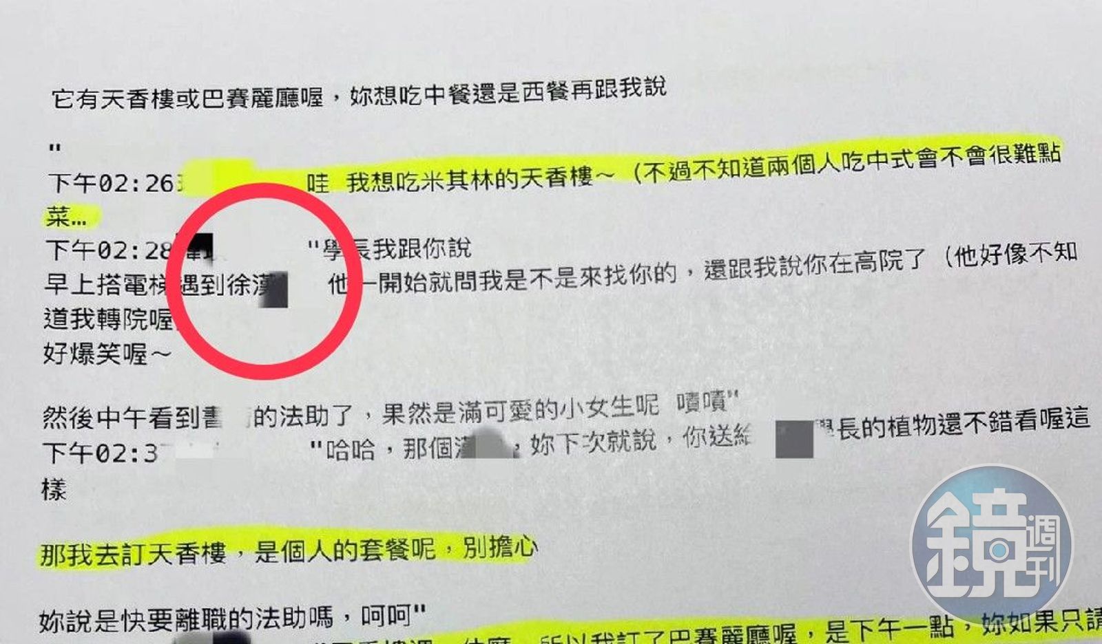 林律師貼在臉書上的對話提及,已婚女男法官與已婚女法官相約吃飯時,雙方討論「天香樓或巴賽麗廳喔,你想吃中餐還是西餐再跟我說」,女方回答說「我想吃米其林的天香樓」,由於對話中提及在電梯遇到了誰(某司法官),轉院(檢察官轉任法院法官)、高院等關鍵字,懂的人一看就懂,法界還傳言,有人向這位在電梯內被遇到的司法官查證,立即比對出林姓律師指控涉婚外情的2位法官是誰。