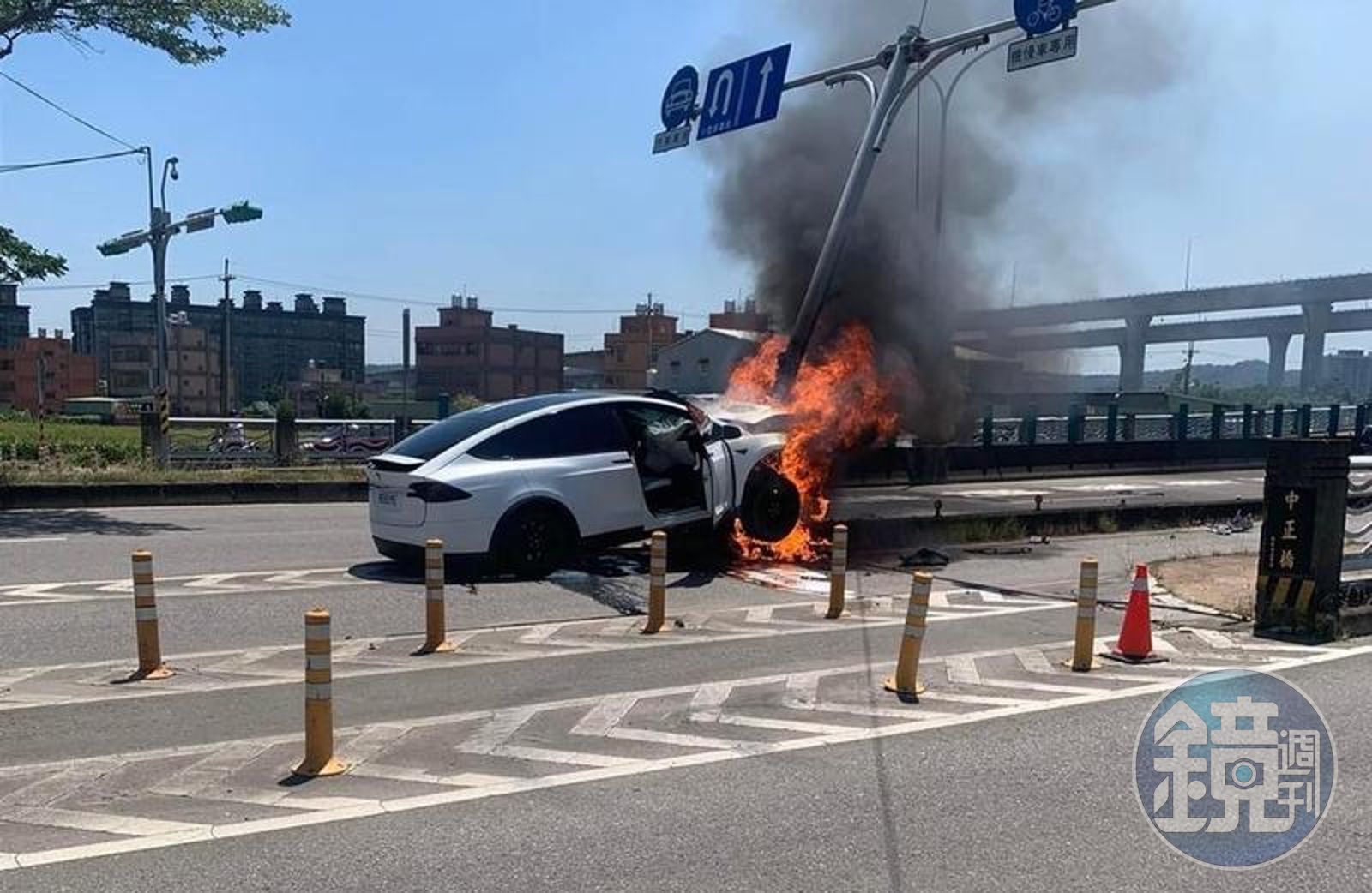 林志穎22日開著特斯拉載著兒子,行經於桃園中正北路時發生自撞意外,特斯拉瞬間燒成火球。(翻攝自記者爆料網)發布時間:2022.07.24 08:57 臺北時間