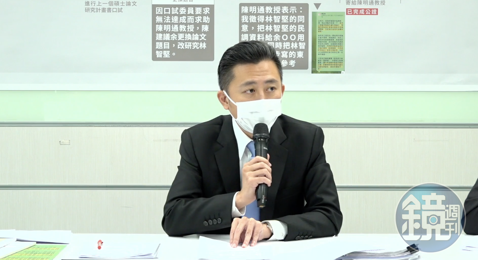 林智堅表示,他並非抄襲研究生余正煌的資料,而是林智堅完成大部分研究設計內容,之後台大國發所教授、國安局長陳明通將林的計畫書草稿和民調資料,提供給余。林的研究題目,絕對比余更早,稱自己是出於善意提供資料,並公開碩論寫作時間軸。