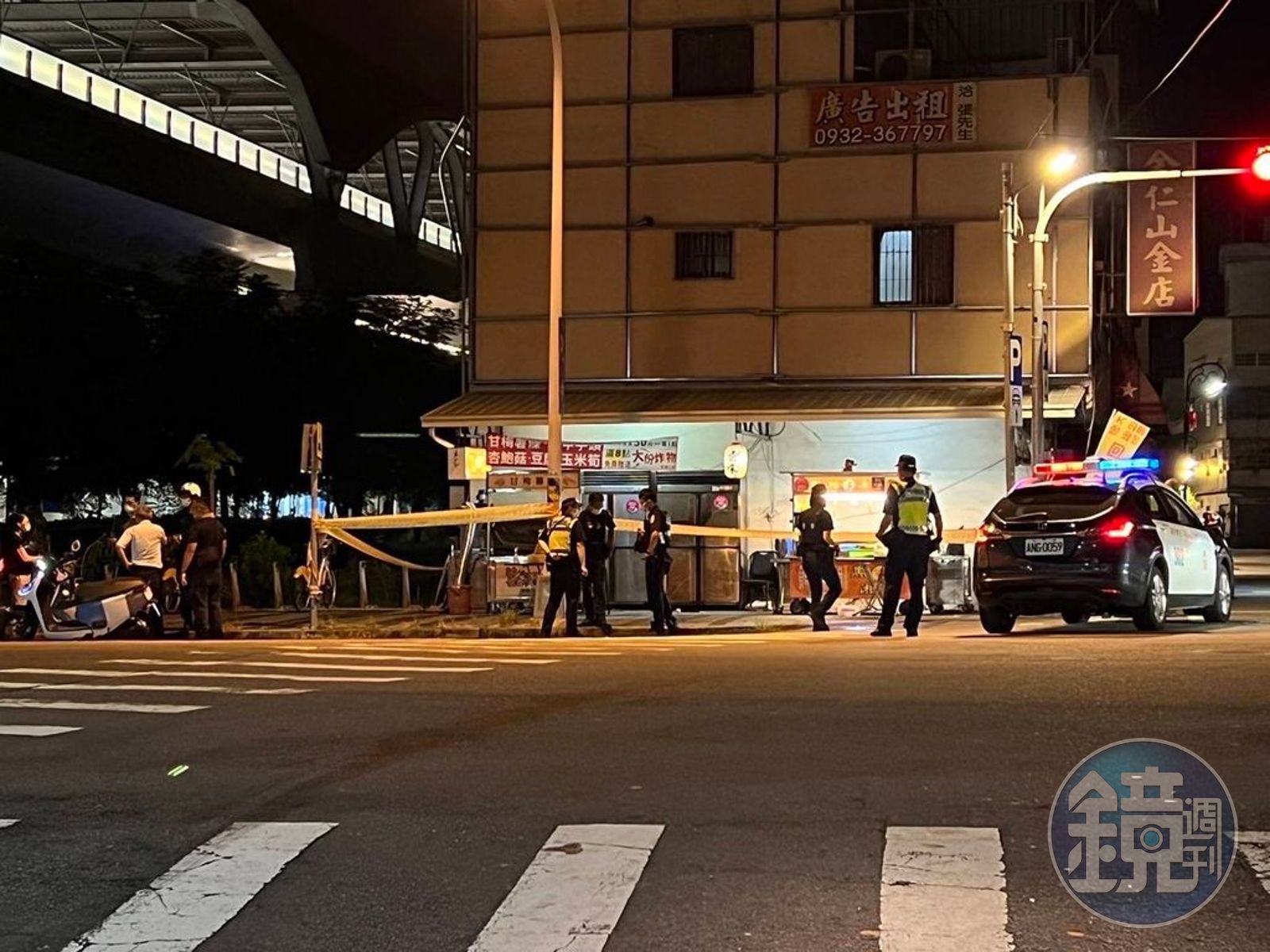 潭子發生行刑式槍擊案,曾姓滷味攤老闆遭一名BMW男朝頭部連開3槍,警方獲報封鎖現場蒐證。(翻攝自記者爆料網)發布時間:2022.07.25 06:11 臺北時間