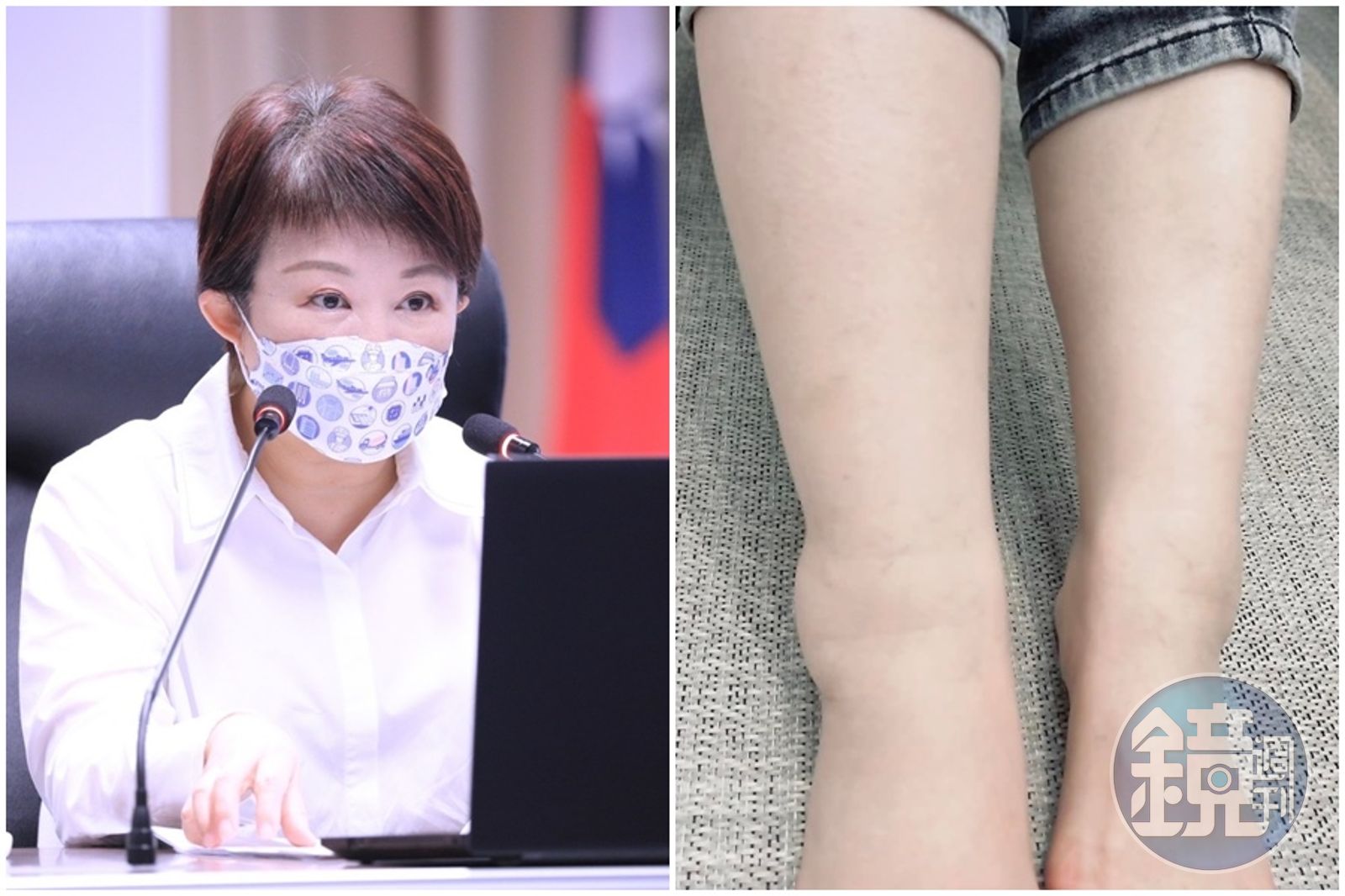 盧秀燕今(27日)透過臉書表示,本來以為過兩天就可以走動,但走訪行程加上開會久坐,造成右腿重新腫脹,兩條腿一粗一細,家人看了都搖頭。