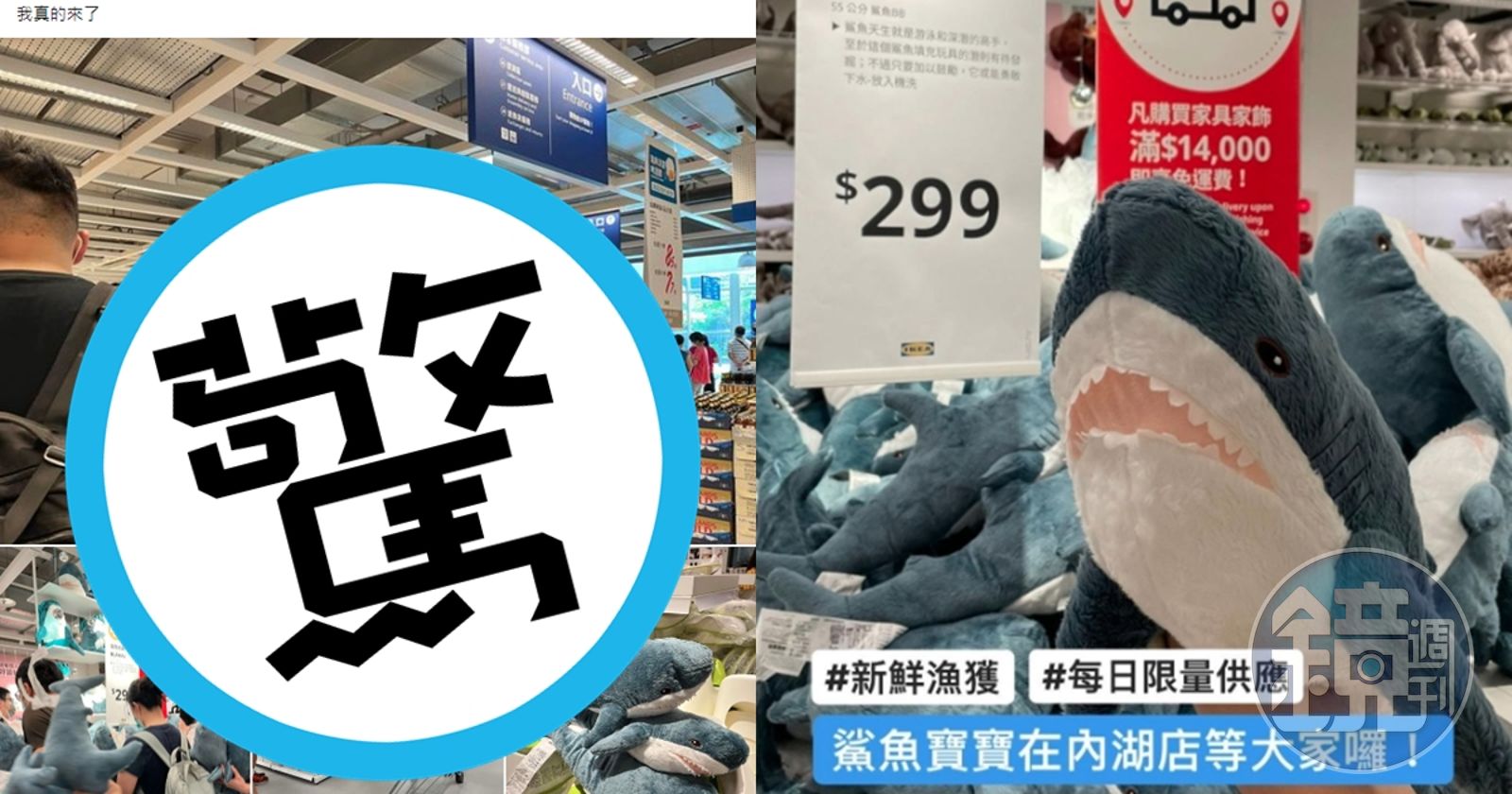 IKEA原版的鯊魚布偶尺寸100公分、售價699元,近期在各分店陸續上架新版小鯊魚,尺寸55公分、售價299元,不少鯊鯊粉在得知此消息後非常期待,IKEA內湖店也宣布小鯊鯊終於在今日「游到內湖啦」,並透露即日起至7月31日,每天都會釋出200隻左右新鮮上岸的小鯊。