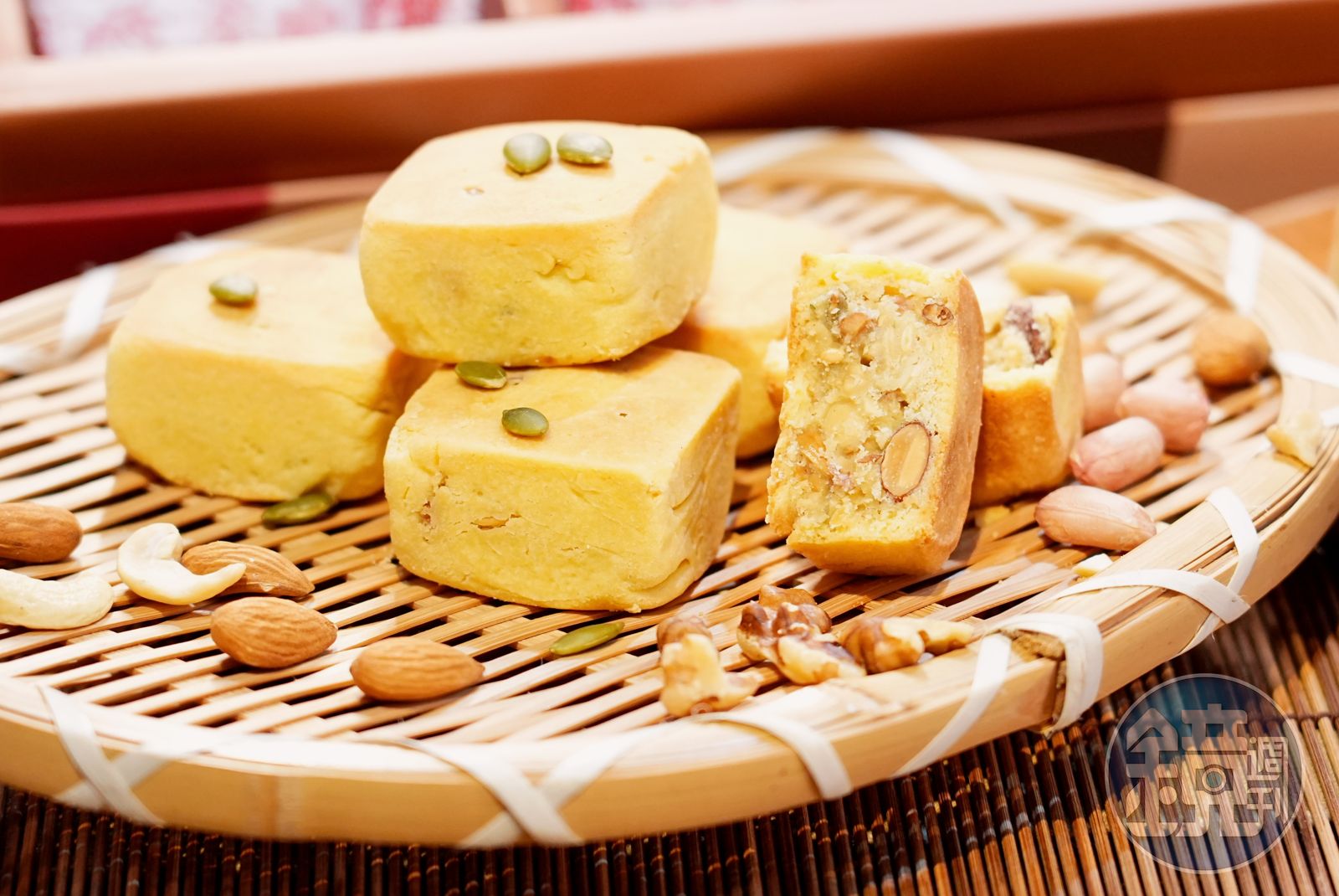 「香脆的堅果和餅皮意外的融合,純天然的風味,剛好符合現代健康飲食風潮。」這是美食家王宣一當年為二崙佳美伍仁酥下的註解。可別小看這只有鳳梨酥大小的伍仁酥,小小一塊製作起來卻異常費工,花生、核桃、杏仁、南瓜子等7種堅果,必須逐一烘烤,再用麵粉與少量奶油炒乾,加入堅果揉成餡料團。