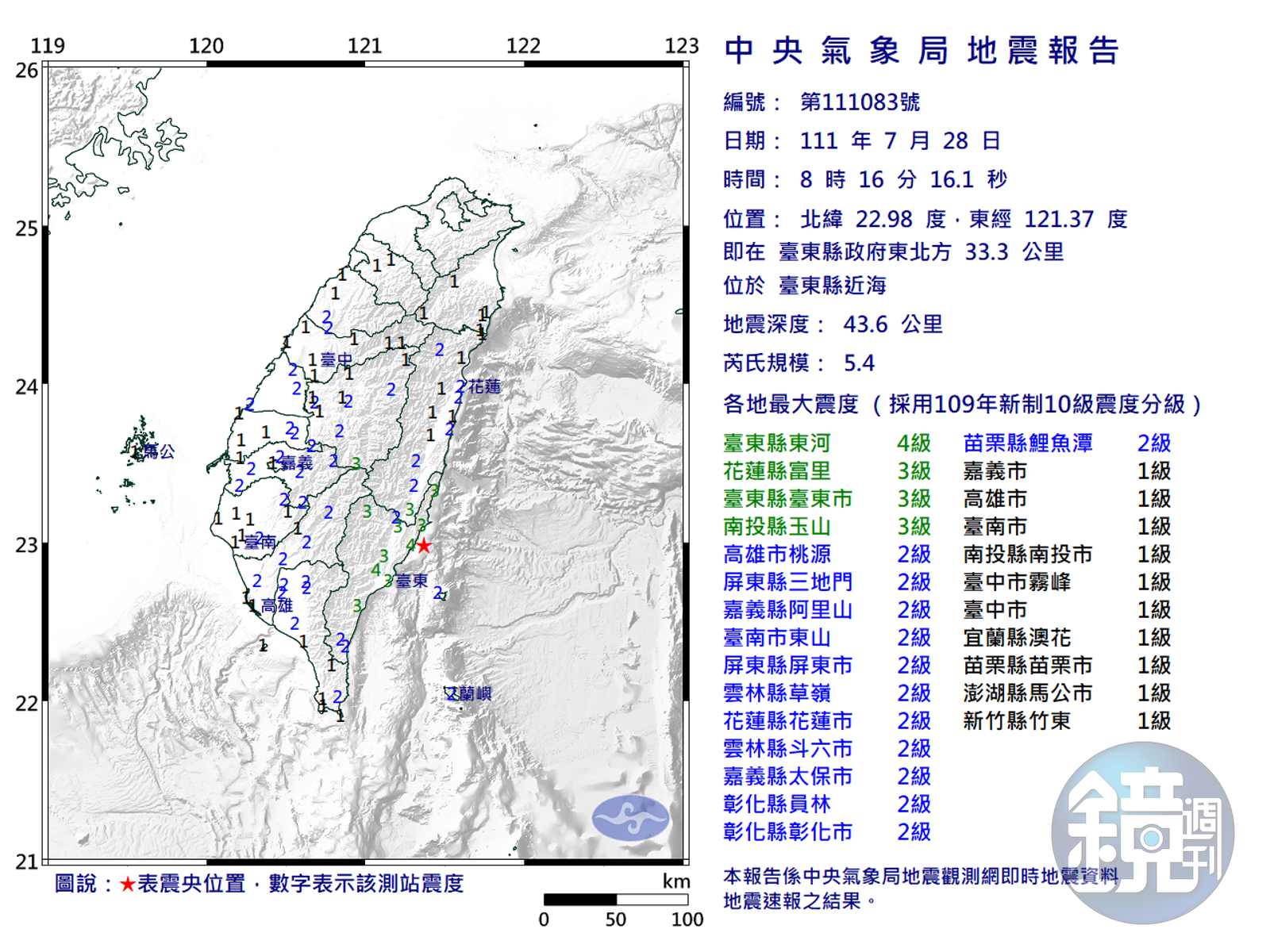 中央氣象局表示,台東縣政府東北方33.3公里、位於台東縣近海8時16分發生芮氏規模5.4、深度43.6公里的地震,台東縣最大震度4級、花蓮縣與南投縣3級,高雄、屏東、嘉義縣、台南、雲林、彰化、苗栗2級。 中央氣象局發布災防告警訊息,直指8時16分台東地區發生顯著有感地震,慎防強烈搖晃,就近避難「趴下、掩護、穩住」。