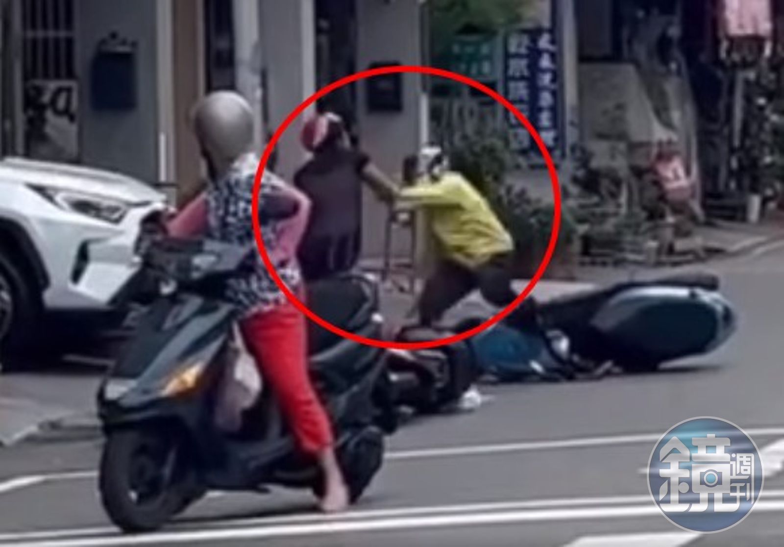 黃衣女站起來後心有不甘,嘴上念念有詞,手往衣服口袋摸了一下似乎要報警,但她和黑衣阿嬤又起了口角,阿嬤一個箭步上前狂推猛推,攻擊來的又快又猛,直接把黃衣女逼到角落讓人來不及反應。