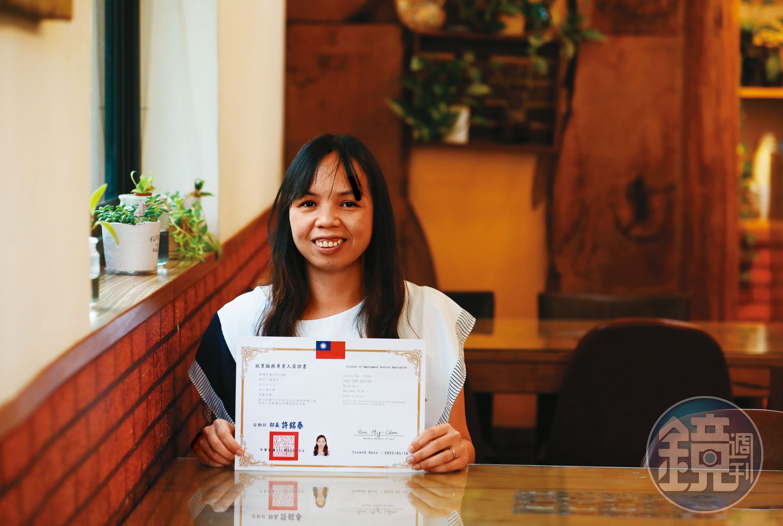 那個證照對台灣人已經很難,我又是新住民,一定要練,像身心障礙的礙,很難記,我就拆字,左邊是石,中間上面像「七」,7個石頭砸下來就變身心障礙。我考了4次,前2次不懂方法,很挫折,就放棄了,5年後決定再考,下載學習APP,逼自己再累也要每天讀。