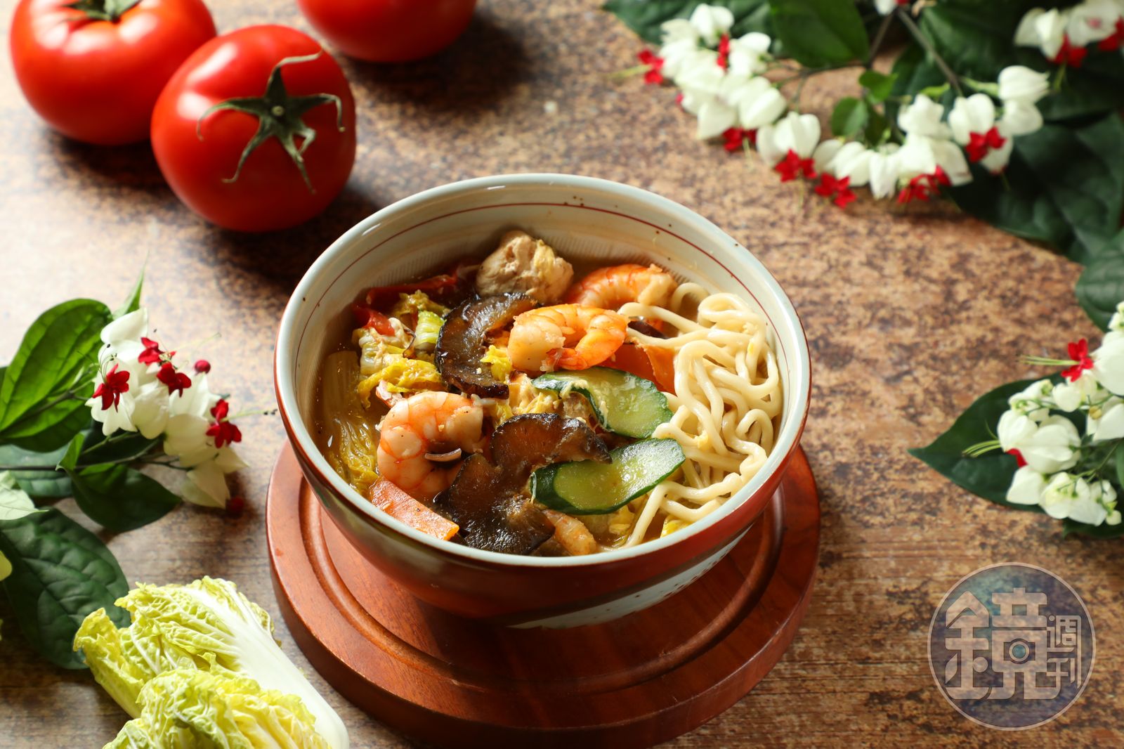 之後,下海參片、蝦仁、雞肉片爆炒,再將所有蔬菜片熗鍋快炒。下熱水,您會聽到「喳」一聲,香味四溢。水滾,下鹽、白胡椒試味,下寬麵。